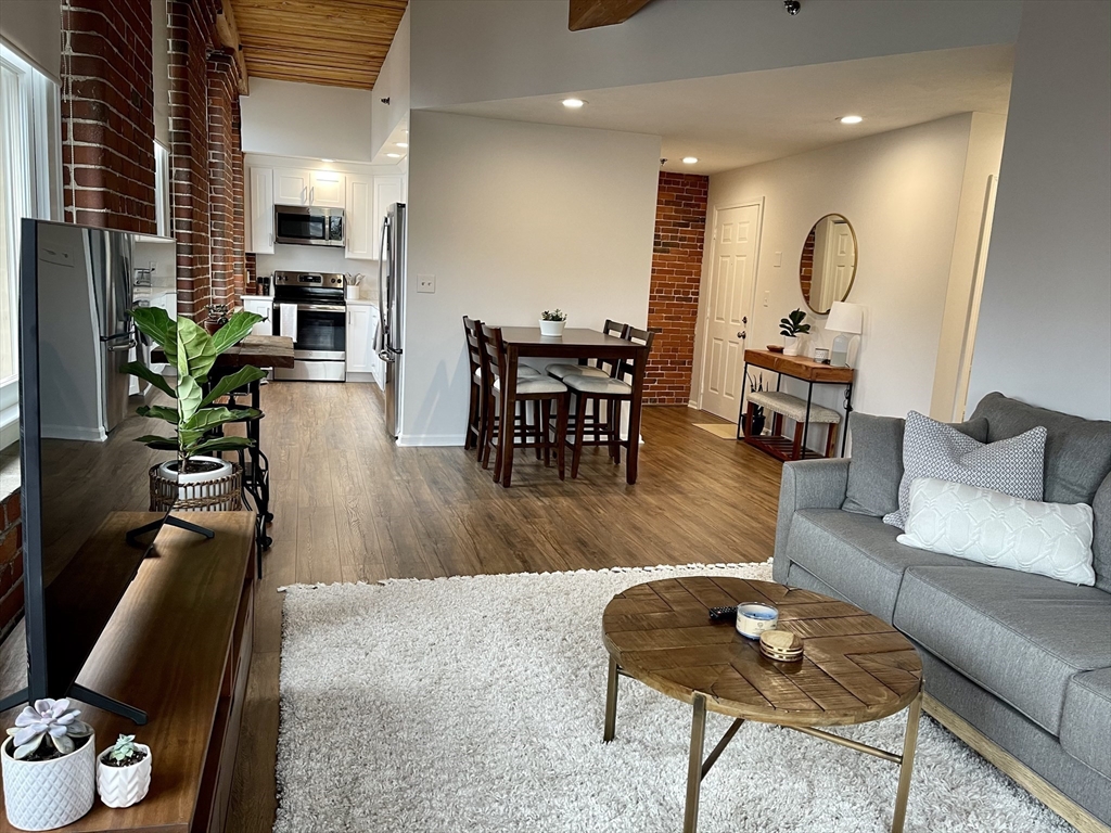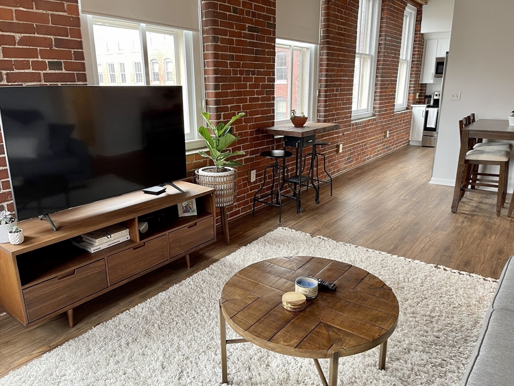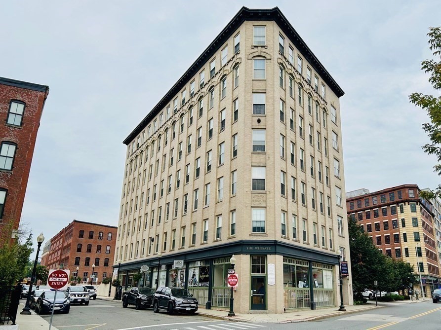 Make yourself at home in this stunning 1bd/1ba condo in the heart of Downtown Haverhill! Located in the historic Wingate building, this corner unit is filled with character and original features including exposed brick walls, high wood ceilings and tall windows that flood the space with natural light. The kitchen features quartz countertops and stainless steel appliances.The open concept living and dining area allow for many configurations and ample space for a home office. Entire unit was updated in 2020. Rent includes heat, air conditioning, water, 1 deeded parking space and a storage unit. Available April 1st. Rental application required.