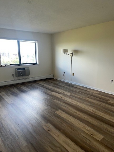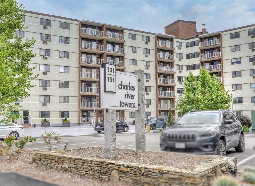Boston Skyline views from your 6th floor Balcony, large 2 Bedroom unit, includes Heat and water, Primary Bedroom with Private Shower Bathroom and walk in closet, 2nd bedroom with large closet, Second full bathroom, Large Livingroom and dining area, Updated Kitchen large enough for a table of 4, Newly painted, New composite Flooring, 2 Parking spots (one in the garage). Large outdoor pool, common area function room may be rented for family gatherings, 2 Common area laundry rooms per floor. Well located building, walking distance to Charles River and the Bike paths, Rowing clubs, Arsenal Yards, Mall with restaurants, shopping, cinema and more. Great commuter location into Boston or the suburbs.