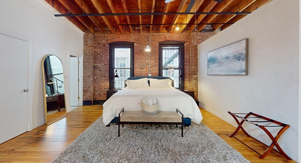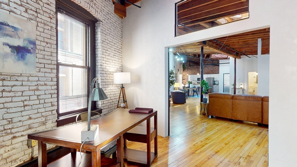 Welcome to Destiny Lofts’ Copley Suite (Unit 3A) — a spacious, fully furnished one-bedroom loft in Boston’s Back Bay. This 1,500 sq ft industrial-chic residence blends history and comfort with exposed brick walls, high wood-beam ceilings, skylights, and large windows that fill the space with natural light. The open-concept layout features hardwood floors throughout, a modern eat-in kitchen with stainless steel appliances, gas range, wine cooler, and breakfast bar seating six. The living area includes a leather sleeper sofa and 65” smart TV, while a dedicated office nook offers flexible workspace. The bedroom features a king bed and generous storage; 1.5 baths add convenience. In-unit washer/dryer, central air, and thoughtful design create a turnkey city retreat. Located steps from Copley Square, Newbury Street, the Back Bay T, and less than a mile to Fenway Park.(WSR Broker of Record – Adele Lurie)