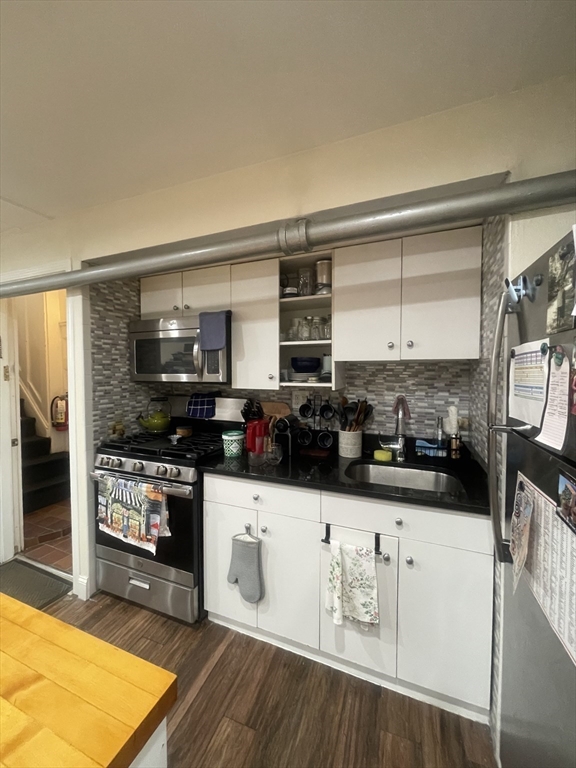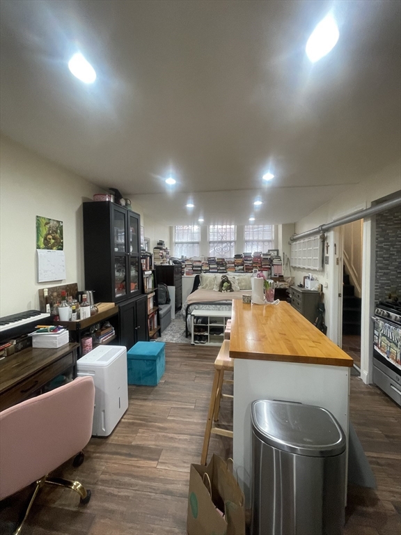 Large studio with updated kitchen full sized stove and refrigerator. Kitchen island remains with the unit. Large bathroom and closet. Plenty of options for furniture. Two entrances, one allows easy access to the common garden area for grilling and relaxing. Common bike storage. No undergraduates please . Cats only. Professionally managed building. Present photos reflect ample furniture in the space.