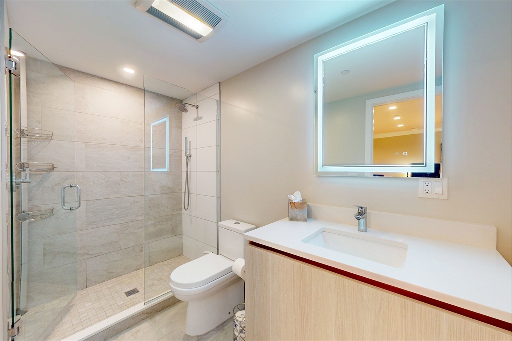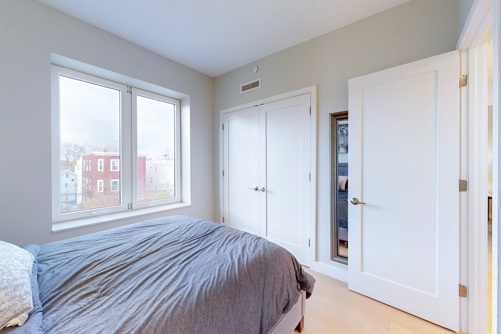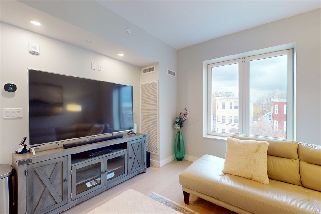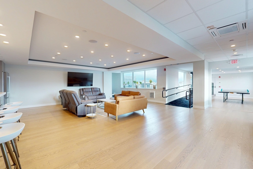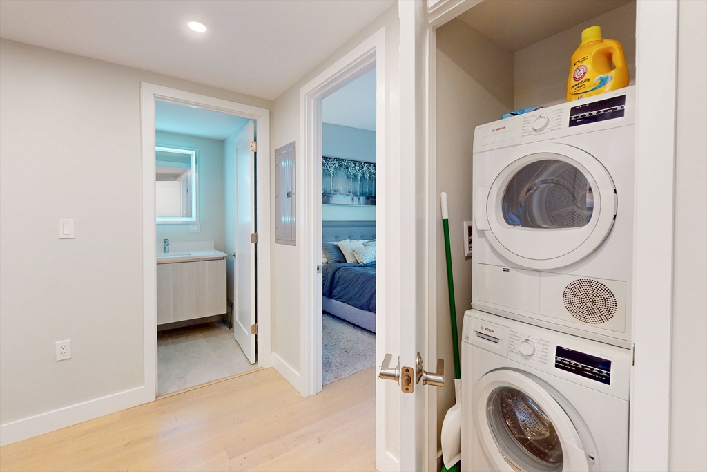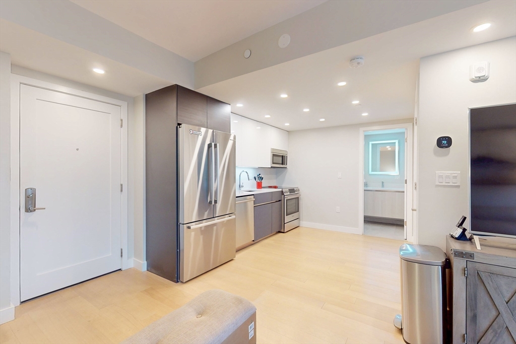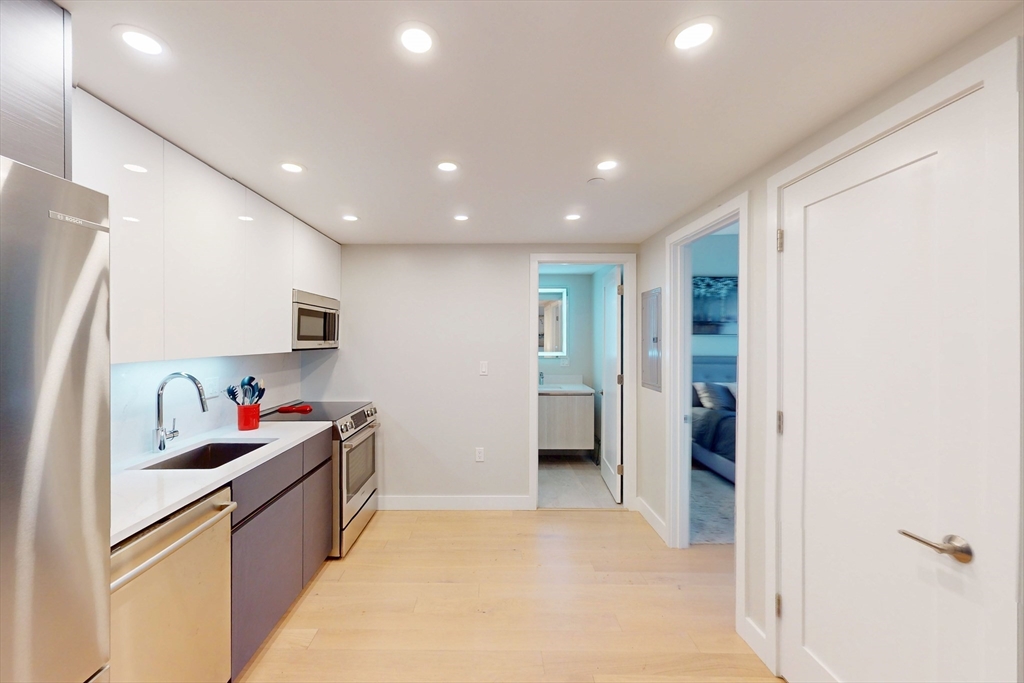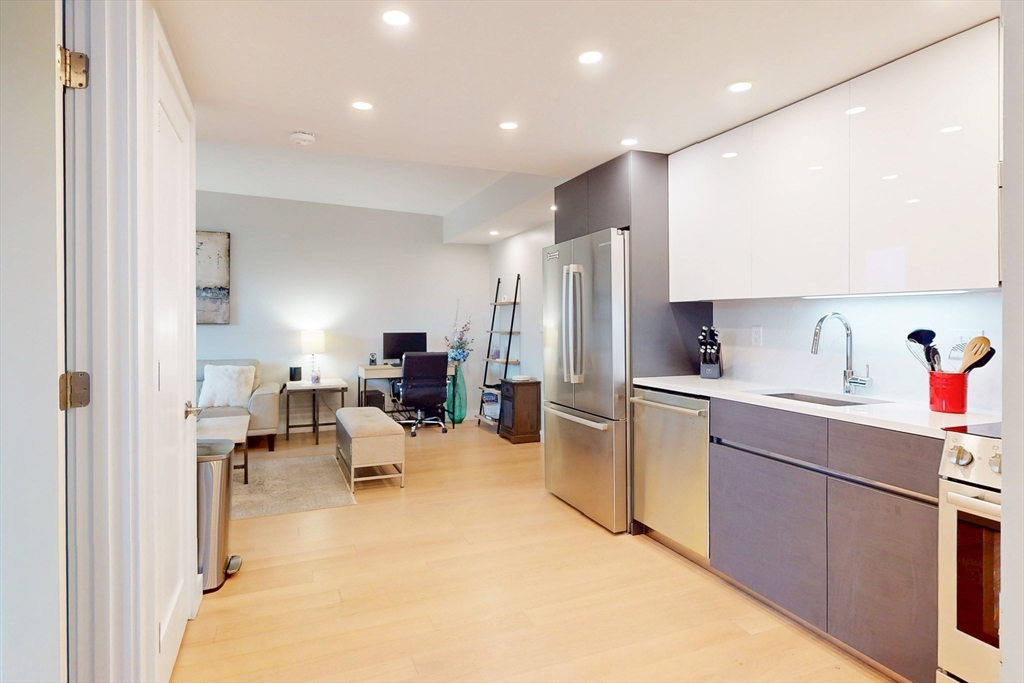 Modern 1-bed condo with garage parking in a prime Chelsea location! This bright corner unit offers 631 sq ft of stylish living space, featuring hardwood floors throughout, oversized windows, and central air. The open-concept living room flows seamlessly into a sleek kitchen with stone countertops, recessed lighting, and stainless steel appliances including a dishwasher, microwave, and gas range. The bedroom fits a queen and includes a custom built-in closet. Enjoy a spa-like bathroom with stone tile and a modern vanity. Additional perks include in-unit laundry, intercom security, and shared roof deck access. Located in a well-maintained elevator building near shops, restaurants, public transit, and commuter routes—just minutes to Boston. Available Dec 2nd. Initial lease through summer 2026 with option to renew for additional 12 month terms.
