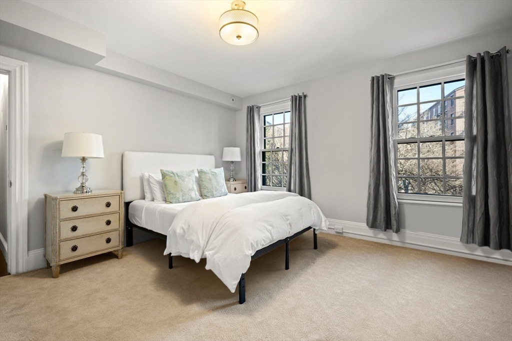 Experience the elegance of this 3-bed plus den, 2.5-bath home with a coveted full parking space. Nestled on Mount Vernon Square in the Flat of Beacon Hill, this duplex residence offers park views and lives like a home. The 30' wide parlor level features a welcoming foyer, expansive living and dining area, and custom-designed kitchen with a double oven, stainless steel range, pot filler, bespoke hood, wine cooler, microwave drawer, and ample storage. 1st floor includes a study area and a half bath. Upstairs, the renovated master suite offers a sitting area, completely renovated marble bathroom with glass-enclosed shower, dual vanities, water closet, walk-in closet, and private deck. The two additional bedrooms have serene square views. Bedroom level includes a laundry room and full bathroom with tiled shower. Parking for one car is located at the front door. Other features include 4 fireplaces, C/A, & excellent storage. Available for furnished short term rental from Feb 1 to April 30th.