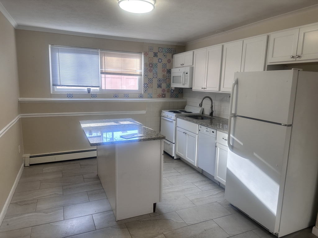 Perfect location for this pristine Condo! Newer kitchen has beautiful white cabinetry with granite countertops and center serving Island. Recessed lighting and newer flooring throughout. Rental fee includes Heat and Water! Two off street tandem parking spots and plenty of guest parking as well. Short distance to commuter rail and bus line. Only steps to shopping plaza for groceries, drycleaners, nail salon and more. Easy access to all major routes. Won't last! Excellent credit and references required.