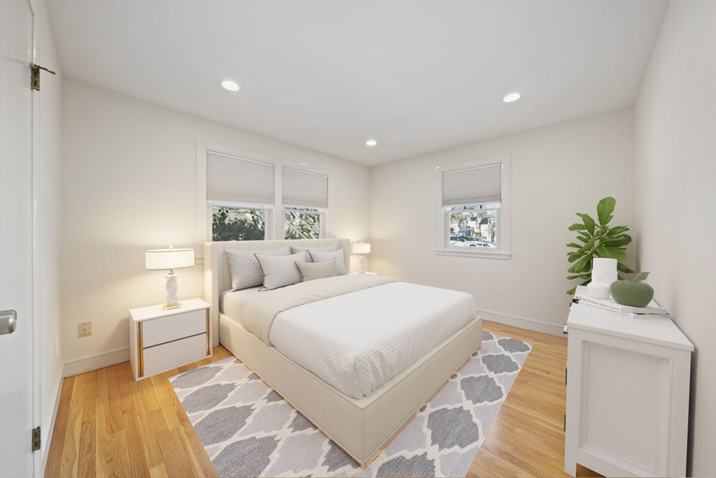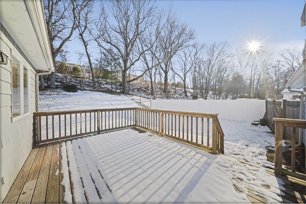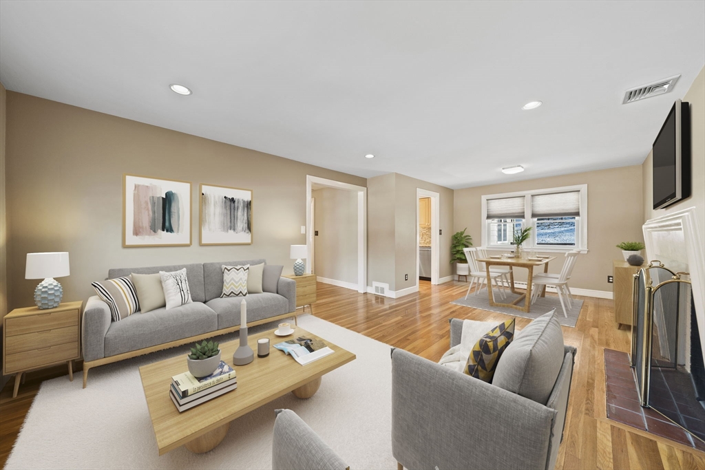 Bright and inviting single-level living awaits in desirable Needham Heights! This well-maintained 3-bedroom, 2-bathroom Ranch sits on a level lot in a quiet, tree-lined setting. Enter to a spacious front-to-back living/dining room bathed in natural light, with gleaming hardwood floors throughout. The eat-in kitchen features gas cooking and flows seamlessly to a sunny family room with vaulted ceiling and skylight—ideal for gatherings—plus a slider to a private deck and fully fenced backyard. The primary suite offers three double closets and private bath; two more bedrooms share a full bath. Comforts include central air, gas heat, and recessed lighting. Less than 1 mile to Needham Heights Commuter Rail, with easy highway access and nearby shops, groceries, cafes, and restaurants. Move-in ready—perfect for commuters and families. Schedule your showing today!