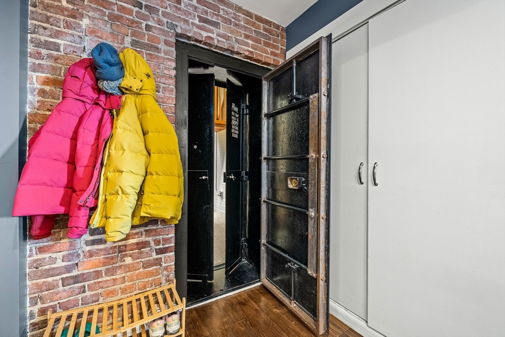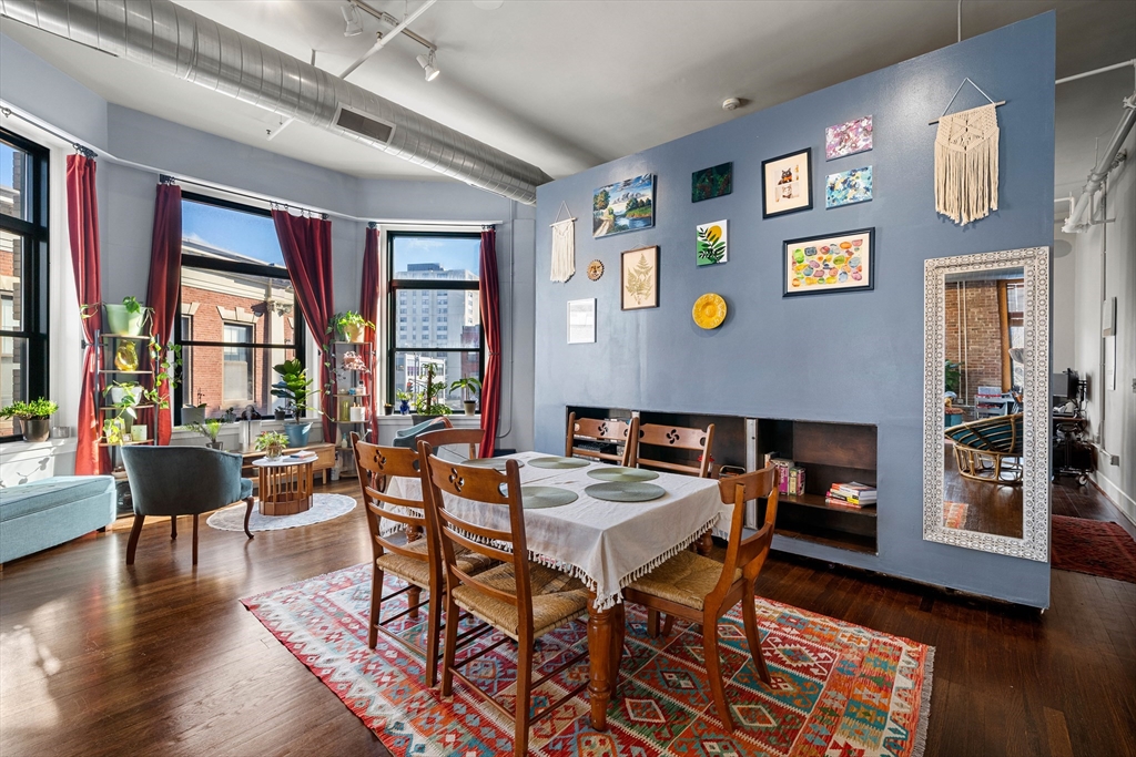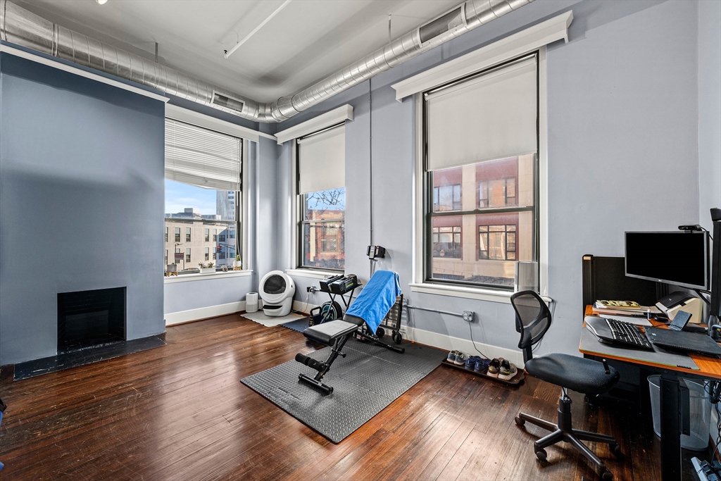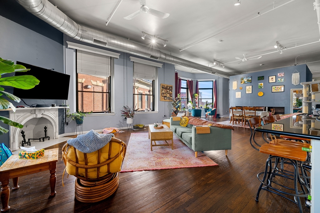 A true showpiece. This rarely available corner loft with parking offers iconic urban style and thoughtful architectural design. The front-facing residence blends historic character with modern creativity, featuring exposed brick, walnut-stained hardwood floors, soaring ceilings and curated industrial details throughout. The expansive and flexible open layout—anchored by a striking marble fireplace—creates an ideal environment for entertaining, working and everyday living. The dynamic floor plan easily accommodates up to three separate sleeping areas along with multiple work-from-home and creative spaces .Architectural highlights include a dramatic 10x12 sleeping alcove and a one of a kind steel vault with industrial steel doors, offering distinctive upper-level sleeping quarters, a private office or an inspired guest retreat.