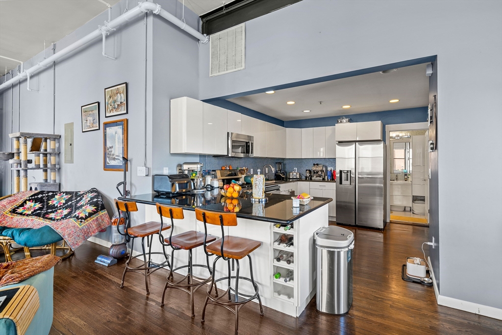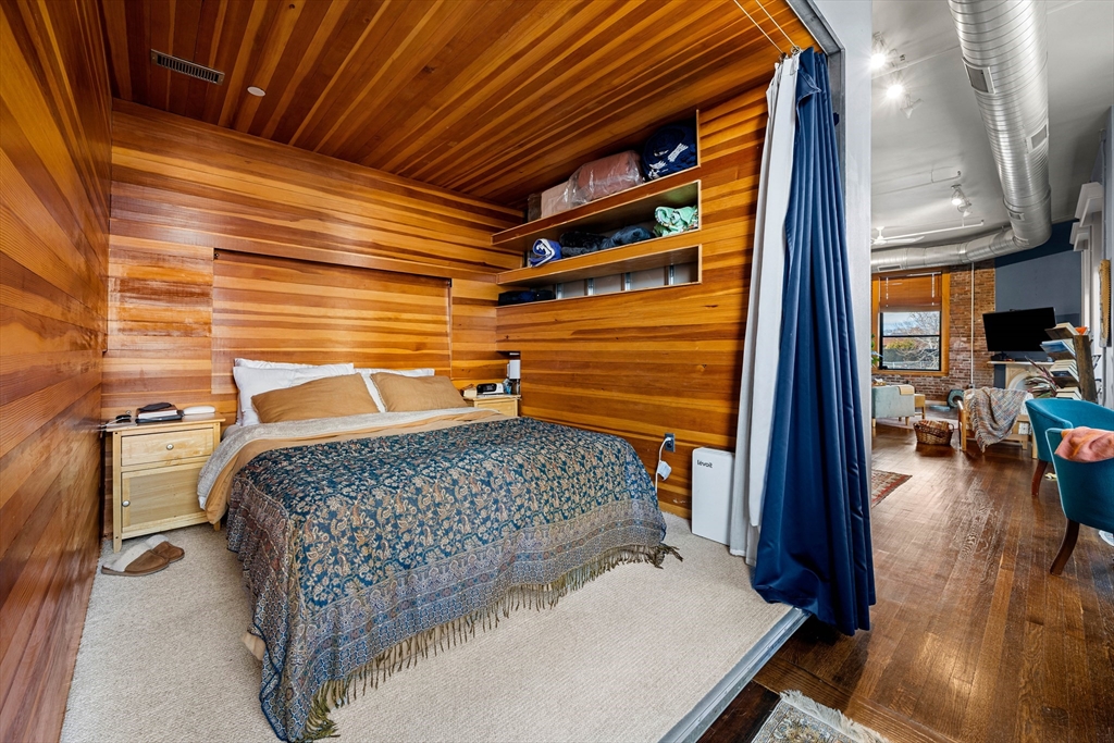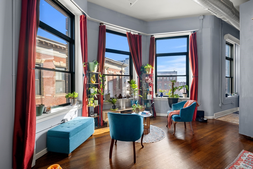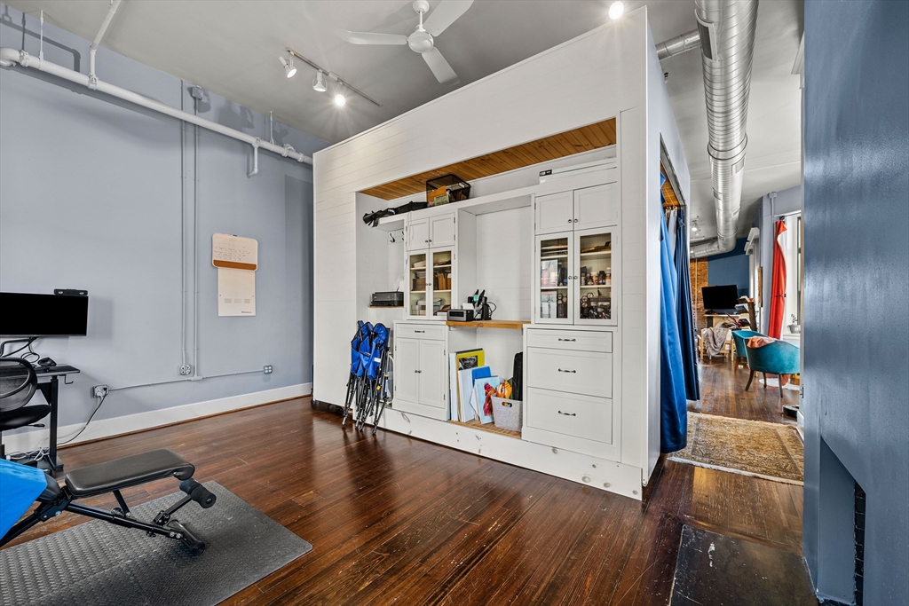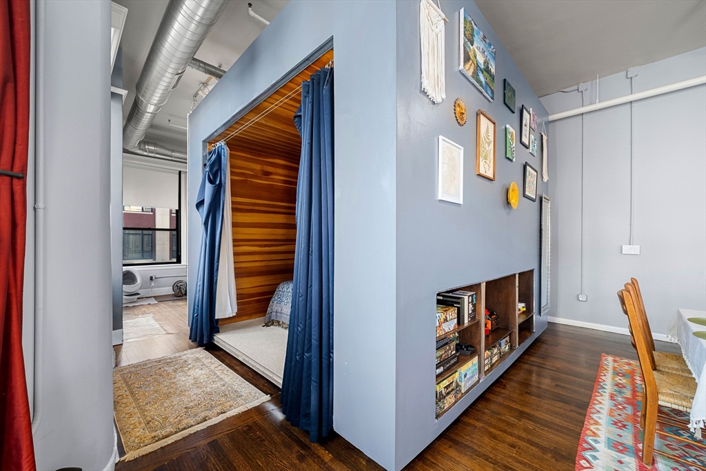 A true showpiece. This rarely available corner loft with parking offers iconic urban style and thoughtful architectural design. The front-facing residence blends historic character with modern creativity, featuring exposed brick, walnut-stained hardwood floors, soaring ceilings and curated industrial details throughout. The expansive and flexible open layout—anchored by a striking marble fireplace—creates an ideal environment for entertaining, working and everyday living. The dynamic floor plan easily accommodates up to three separate sleeping areas along with multiple work-from-home and creative spaces .Architectural highlights include a dramatic 10x12 sleeping alcove and a one of a kind steel vault with industrial steel doors, offering distinctive upper-level sleeping quarters, a private office or an inspired guest retreat.