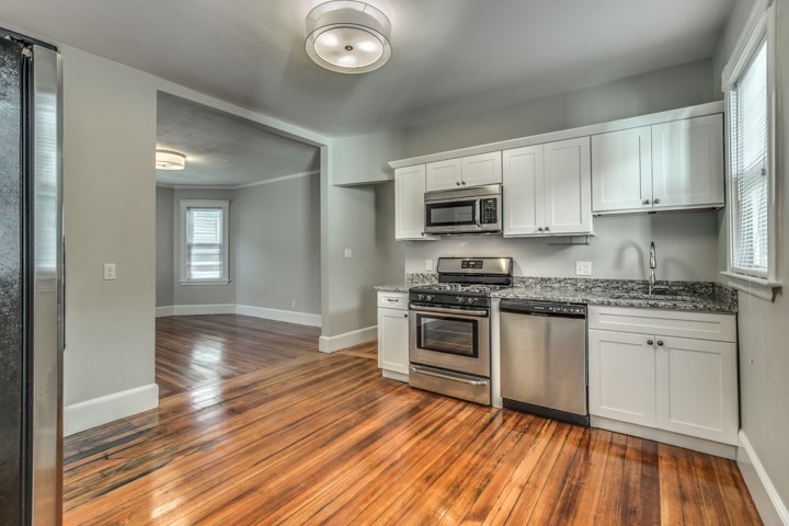 Modern and nice 2 bedroom, 1 bath rental unit in 3-family home with WFH office. Hardwood floors throughout, modern appliances, and in-unit laundry. Front and back decks. Shawmut- redline is on same street. Commuters dream. T