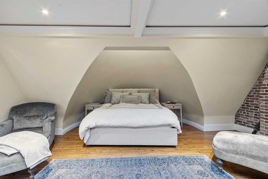 Historic Commonwealth Avenue Penthouse opportunity with private roof deck and one deeded parking space in rear of building. This duplex home that overlooks the Commonwealth Mall is located in a Romanesque style brownstone which has two bedrooms, two full spa like marble bathrooms, and an elegant front facing living and dining room with original detail fireplace, bay windows, and French doors to the kitchen with appliances by Sub Zero, Bosch and Thermador. The loft-like master bedroom with skylight encompasses the upper level and connects to a separate sitting area, large walk-in closet and full bath with stackable laundry. Modern amenities include recessed lighting, a wet bar, new gas lines installed throughout the building, central A/C with newer compressor, and updated elegant common spaces all in a professionally managed association. A full staircase leading to roof deck offers wonderful views of tree-lined Commonwealth Avenue and the Back Bay skyline.