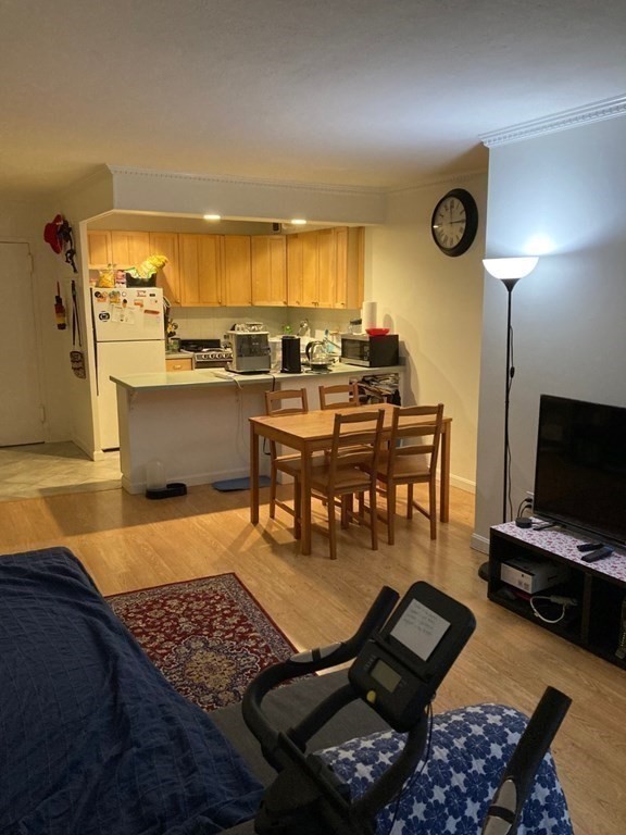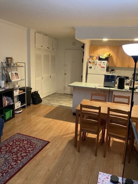 Renovated one bedroom with an adjacent patio, common roof deck, 24-hour security (daytime concierge, nighttime security), common laundry, bike storage, heat, and hot water included, with updated kitchen. The unit is available on 5/1/26. The building has a move-in and move-out fees. No smoking. On-street parking. The new tenant is responsible for his/her agent's compensation.