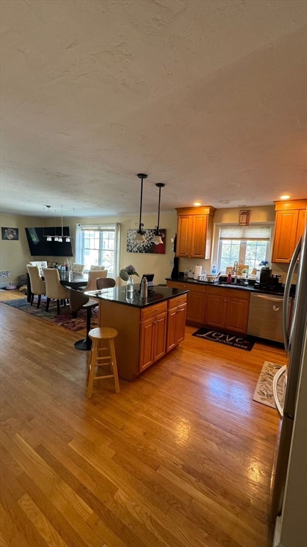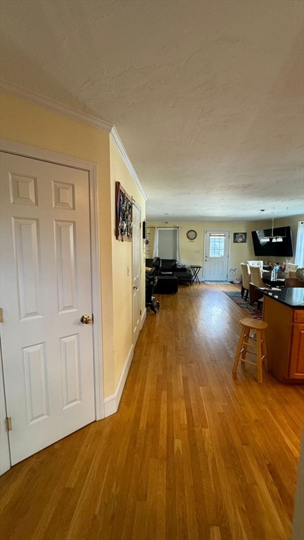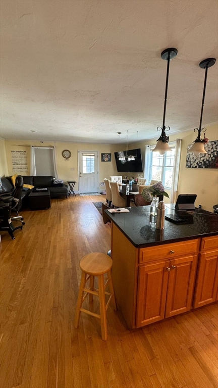 Discover a unique property ideally located near Quincy Center, offering easy access to public transportation, including the nearby Red Line and a bus stop right at the door, along with convenient highway access to Boston and beyond. This home is a commuter's dream, boasting a pristine, move-in-ready interior with freshly painted walls, gleaming hardwood floors, and updated kitchen countertops. Enjoy modern track and recessed lighting throughout. The open floor plan on the first floor seamlessly connects the kitchen, dining, and living room, with direct access to a private yard through sliding doors. Upstairs, you'll find a spacious master suite and two additional generously sized bedrooms, complemented by a full bath. Additional storage is available with pull-down attic access. The fully finished lower level provides a large open family room with a gas fireplace and ample storage space, while an attached garage offers direct access to the home, adding convenience and security