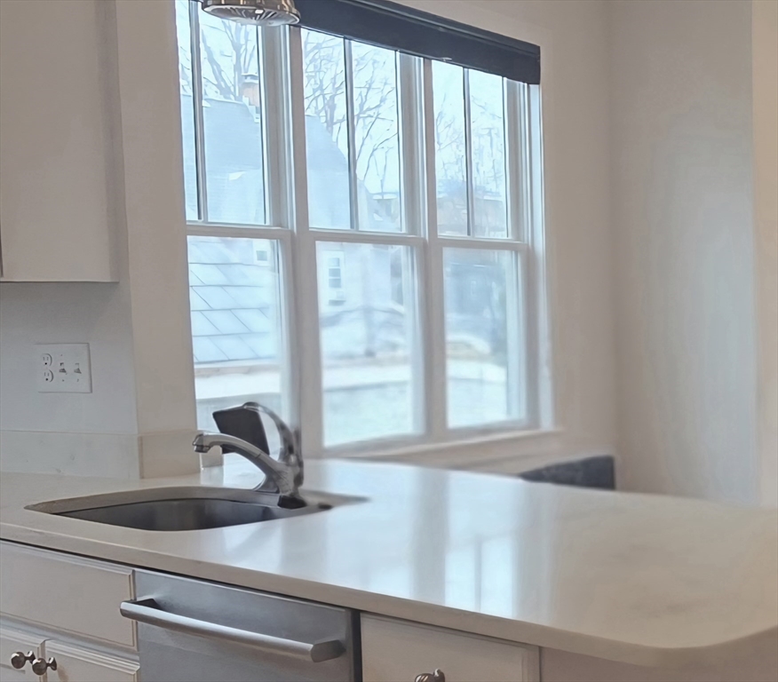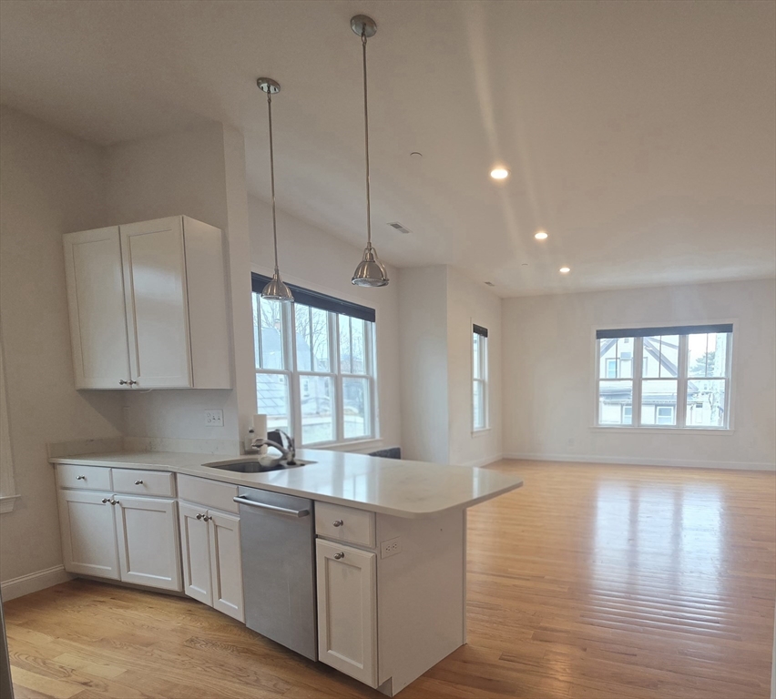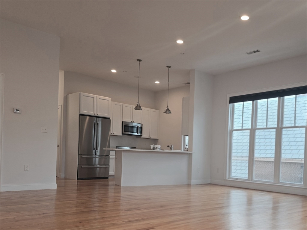 Bright and spacious top-floor condo offering 3 beds, 2 full baths, and ~1,424 sq ft of living space. High ceilings and an open floor plan create an airy living and dining area. Modern kitchen features white shaker cabinets, Carrara quartz countertops, large center island, and stainless-steel Bosch appliances. Private deck with open views, perfect for relaxing or entertaining. Primary bedroom includes en-suite bath with marble tile shower. Two additional bedrooms offer flexible space for guests or home office. Additional highlights include one assigned off-street parking space. Pet-friendly building on a quiet residential street. Conveniently located near Assembly Row, Green Line Extension, shops, restaurants, and easy access to I-93 and Route 28 for commuting.