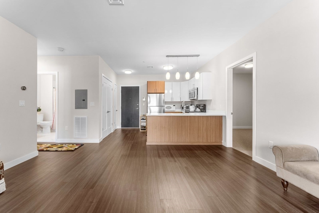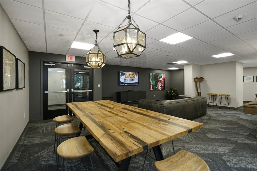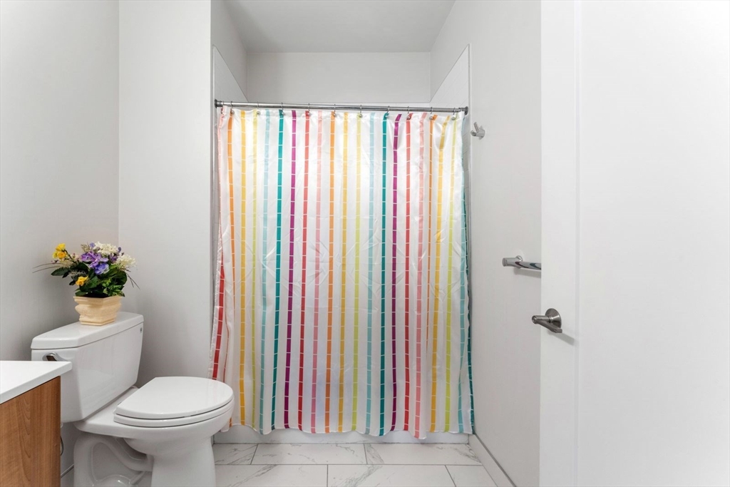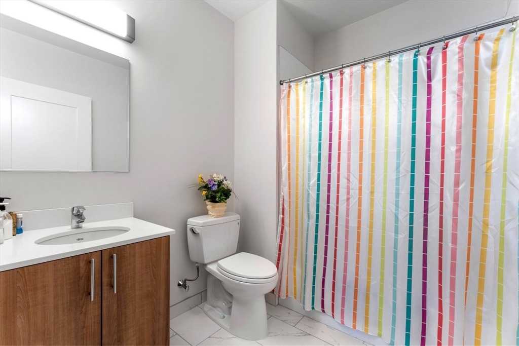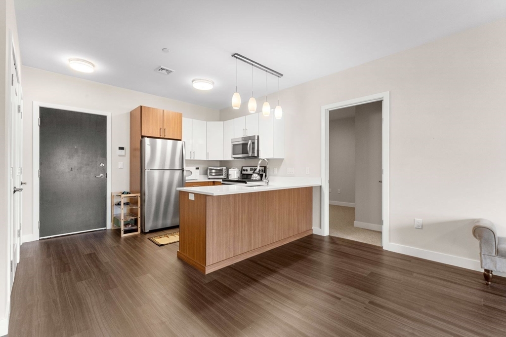 This beautiful condominium is a thoughtfully laid out 1 bedroom plus bonus den with garage parking and offers modern designer finishes and spacious rooms. The open living and dining area provides an excellent space for entertaining. The modern kitchen features custom cabinetry, stainless steel appliances, quartz counters, and peninsula perfect for barstools. Central A/C, Nest thermostats, in-unit laundry complete this fantastic sophisticated unit. Resident amenities include a common function room with a lounge area, large screen televisions, a pool table, and a kitchenette. Additional amenities include a fitness center and yoga studio, multiple outdoor spaces featuring a patio and roof deck both with outdoor seating and a great lawn with a running brook. The property is centrally located and walking distance to MBTA commuter rail, T stop, shop and restaurants in Quincy Center. Sorry, no pets or undergrad students.