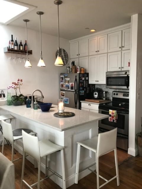Renovated penthouse 1 bedroom with living room and private ROOFDECK. Located on grand Commonwealth Avenue in Back Bay, this building features elevator and laundry. Unit has renovated kitchen with stone countertops, dishwasher, and the unit has hardwood floors throughout. Includes heat and hot water, pets ok.