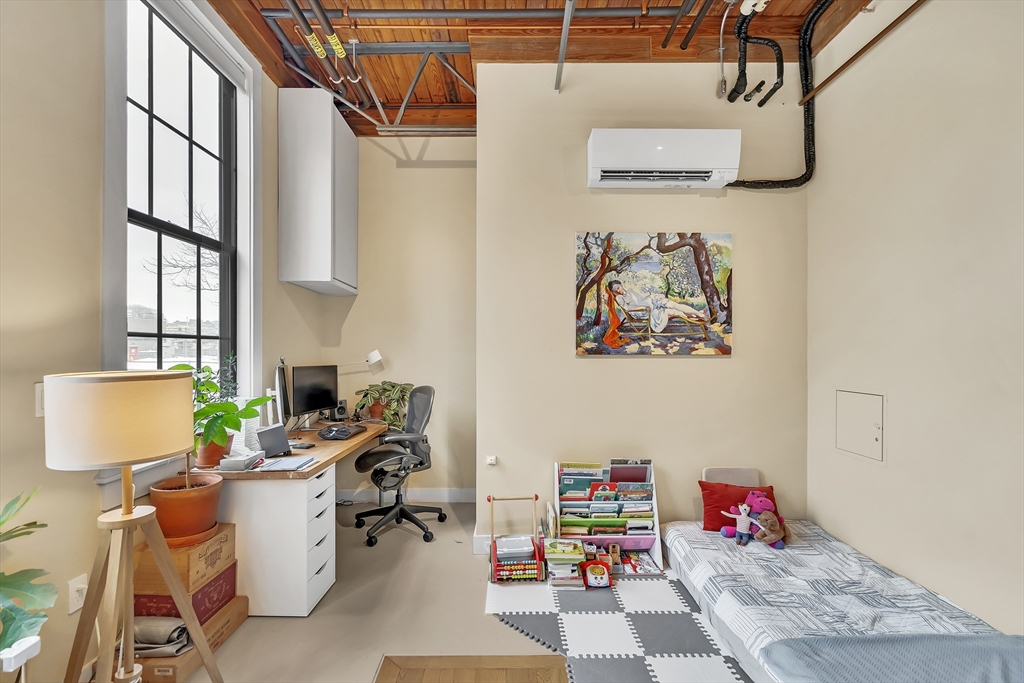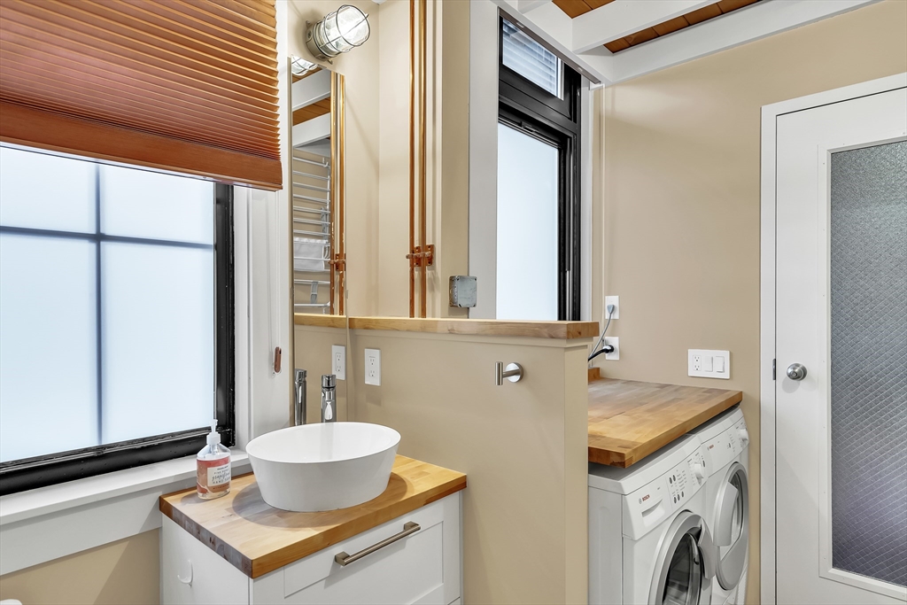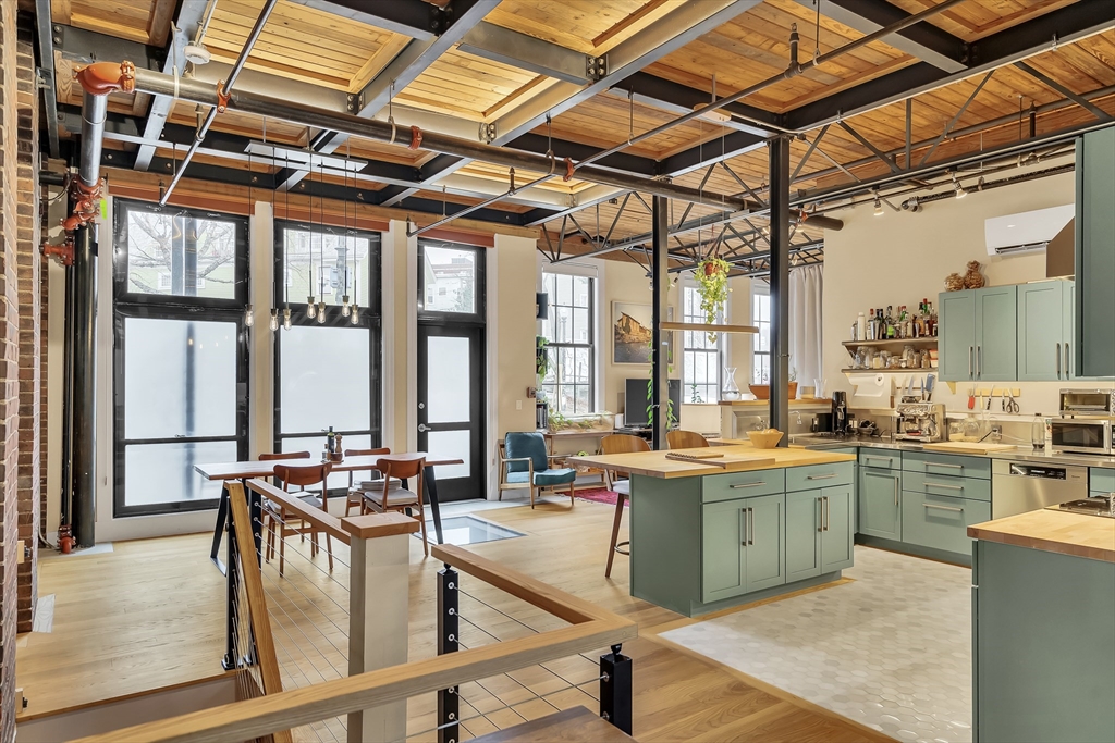 Sophisticated loft-style living with rare privacy in the heart of Davis Square. This thoughtfully designed home features a 480 sq ft great room ideal for living, dining, and work-from-home flexibility, plus true bedroom separation with substantial sound insulation.Floor-to-ceiling south-facing windows flood the space with natural light and overlook the Somerville Community Path, with direct access to miles of car-free biking and walking trails. Enjoy two private outdoor spaces: a sunny south-facing porch and a larger north-facing porch ideal for dining.The chef’s kitchen includes custom cabinetry, butcher block and steel counters, and high-end appliances. The primary suite offers dual closets and en suite bath; a second bedroom and full bath with in-unit laundry complete the home.Bonus 200 sq ft lower level—ideal for office, gym, or storage. Includes one off-street parking space.
