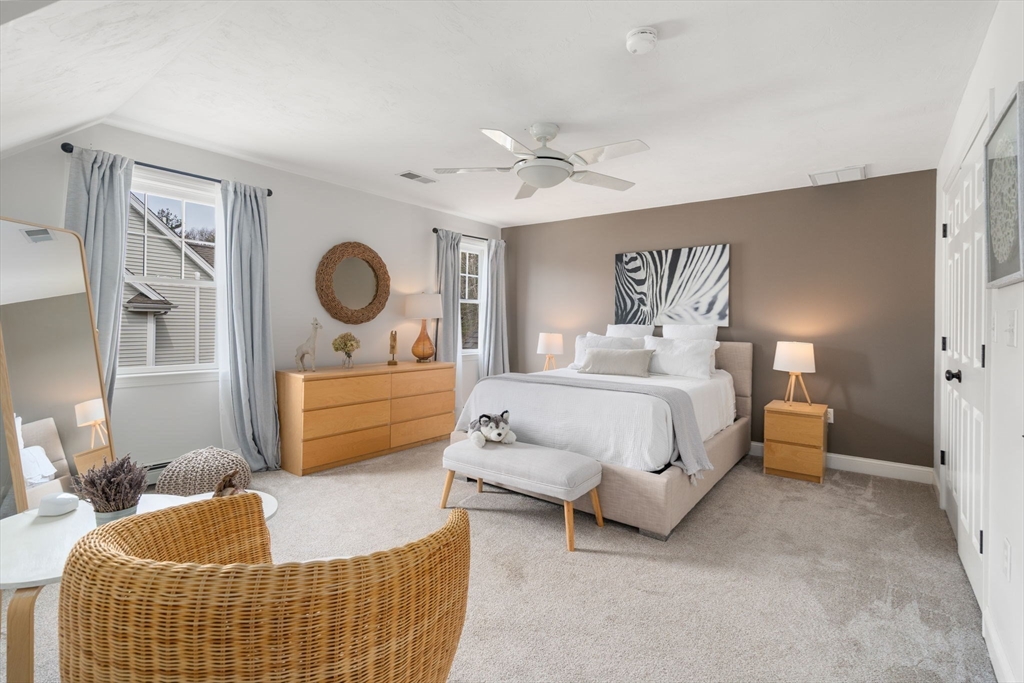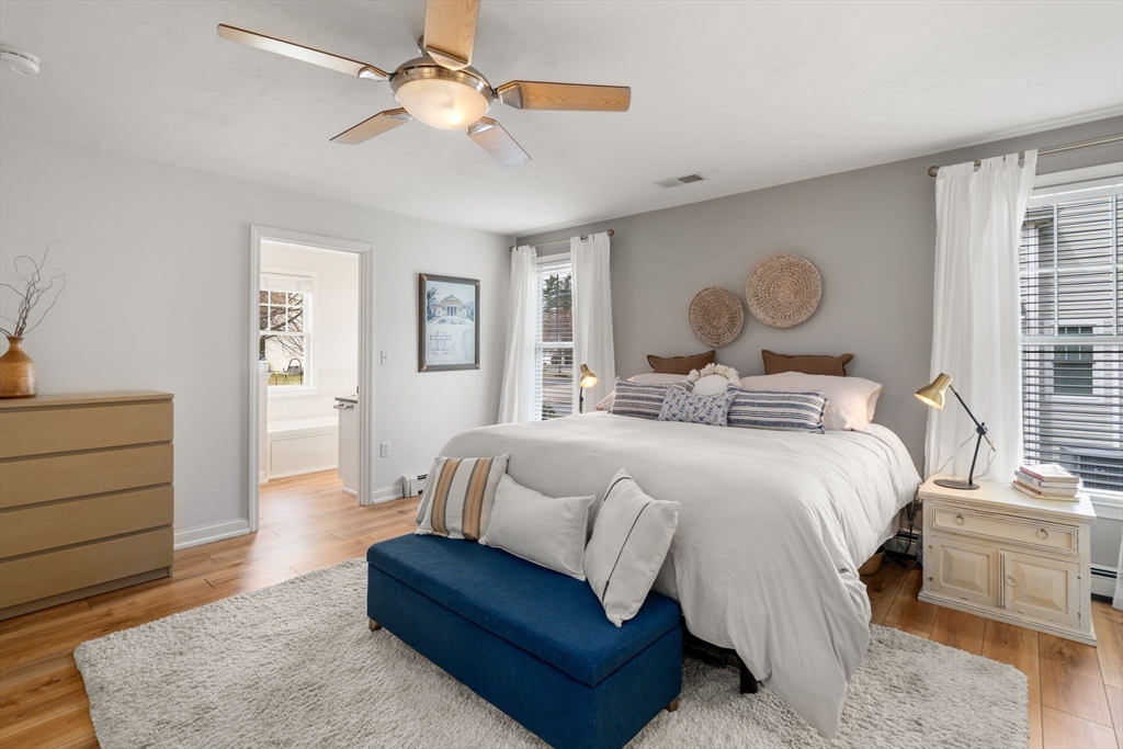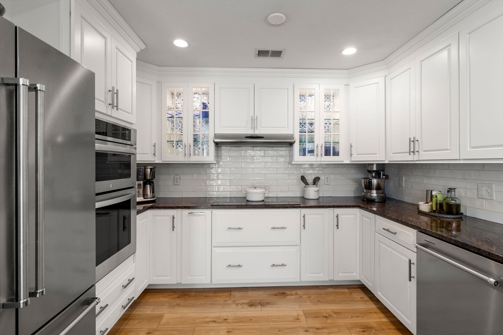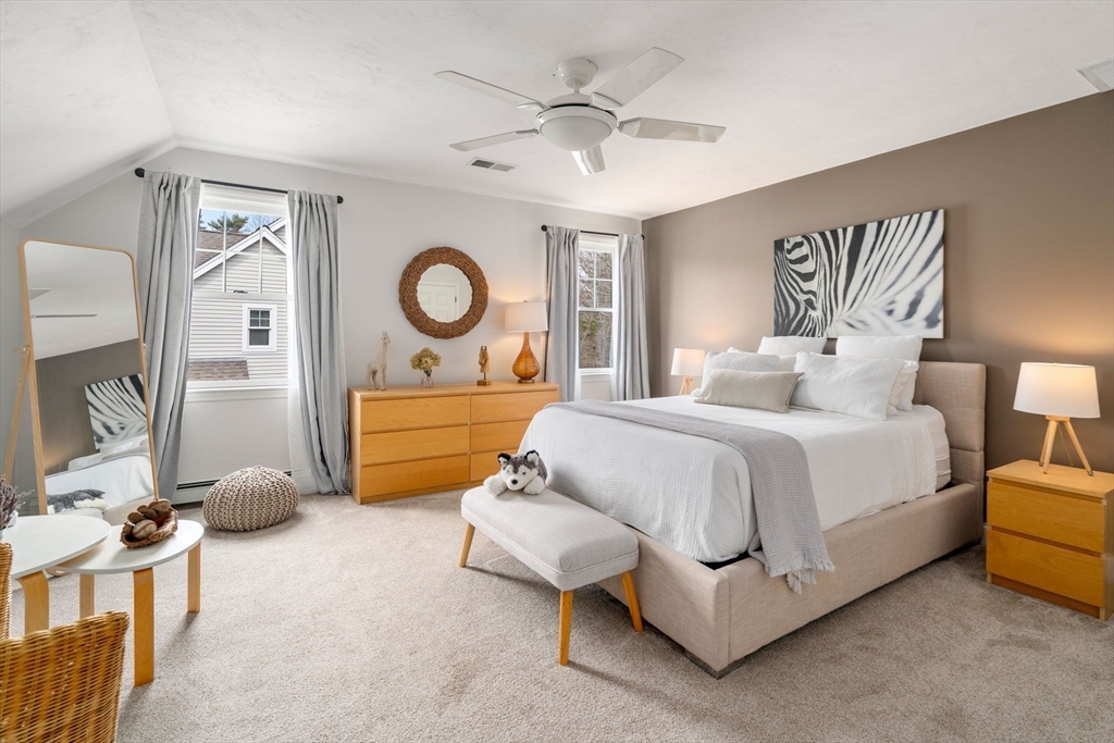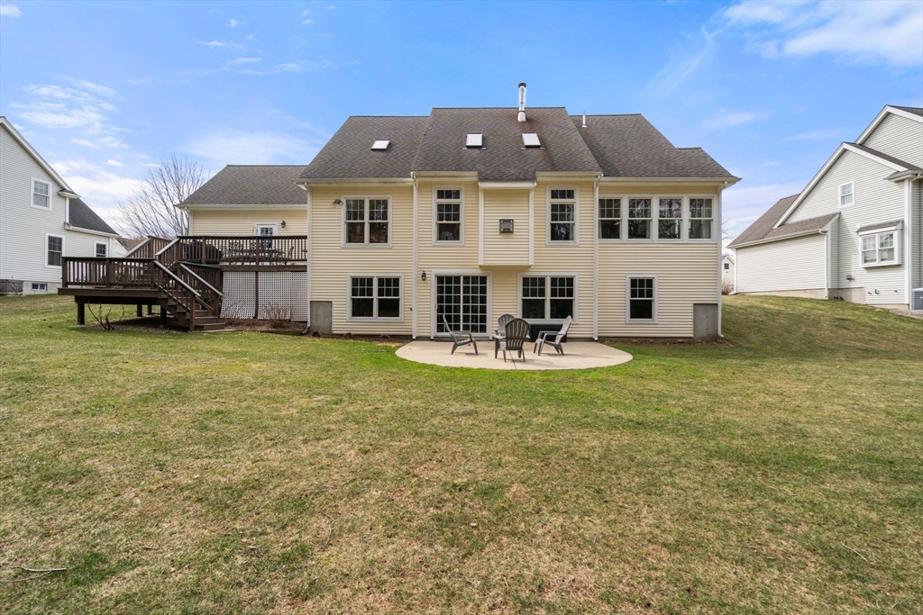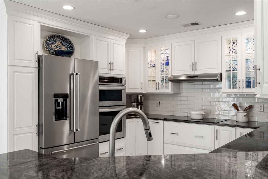 A well sited home overlooking wooded trails, this free standing condominium is the perfect transition to maintenance free living!. With over 3000 sq ft of finished area on 3 living levels every space is fresh and on-trend. A free flowing floor plan features a living room defined by the cathedral ceiling with natural light streaming through double skylights. A year round sunroom is light filled and perfect as an office or sunny retreat. Enjoy evenings by the gas fireplace, enveloped by warmth & natural views. A well planned kitchen features white cabinets with unique details, wall oven, solid cooktop and peninsula for casual dining. A formal dining space steps out to the private deck. The first floor primary en-suite boasts a spa-like bathroom with double vanity, jetted tub, separate shower and walk in closet. Upstairs is a second bedroom, full bath and lofted retreat with walk in attic. The finished walk out lower level features another full bath, wet bar and sliders to private patio.