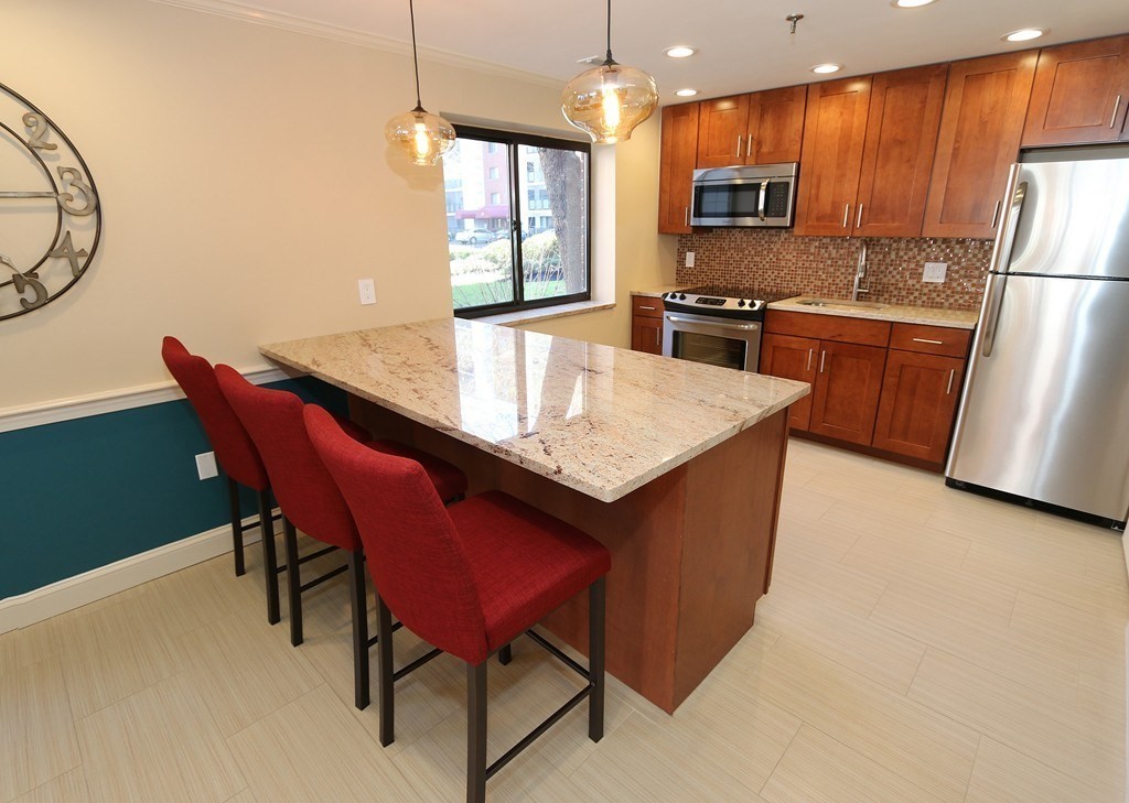 STUNNING! Completely updated 2 Bed, 2 bath, approx 1200 sq ft condo at the desirable Wellington Condo complex in Trendy Wellington Circle. Located on the Orange Line & Minutes to Downtown Boston, this gorgeous 2nd floor corner unit features beautiful eat-n-kitchen w/Quartz counters & stainless steel appliances, in-unit Washer & Dryer,Central A/C, hardwood floors, two walk-in closet & extra basement storage. Short walk to Train (under 10 minutes), Mystic River Reservation & Marina,Station Landing & the ever expanding Assembly Row w/all the shops, bars & restaurants it offers. Walk to Boston Sports Club, supermarket & Starbucks. There's a fully equipped gym,two tennis courts, seasonal outdoor pool w/hot tub,brand billiards/media room which is available for private functions & common area Roof Top deck w/Boston skyline views.The Wellington has a "Street Smart" Walk Score of 84. Can be rented FURNISHED or unfurnished. No short Term. No pets, smoking, subleasing. Credit check required