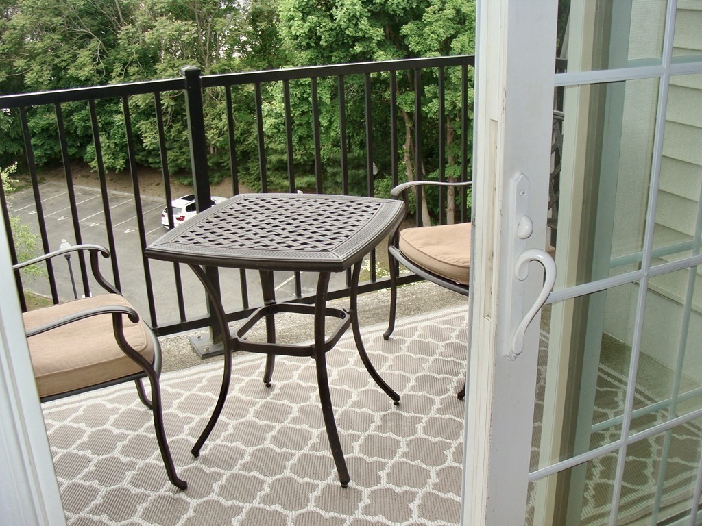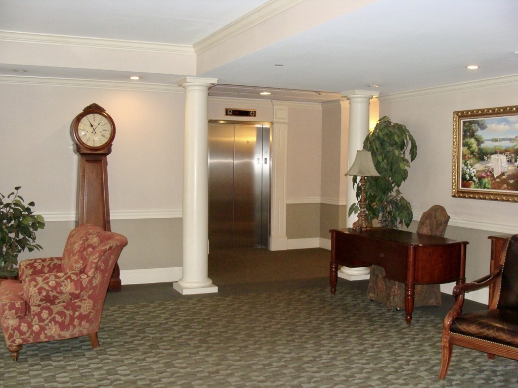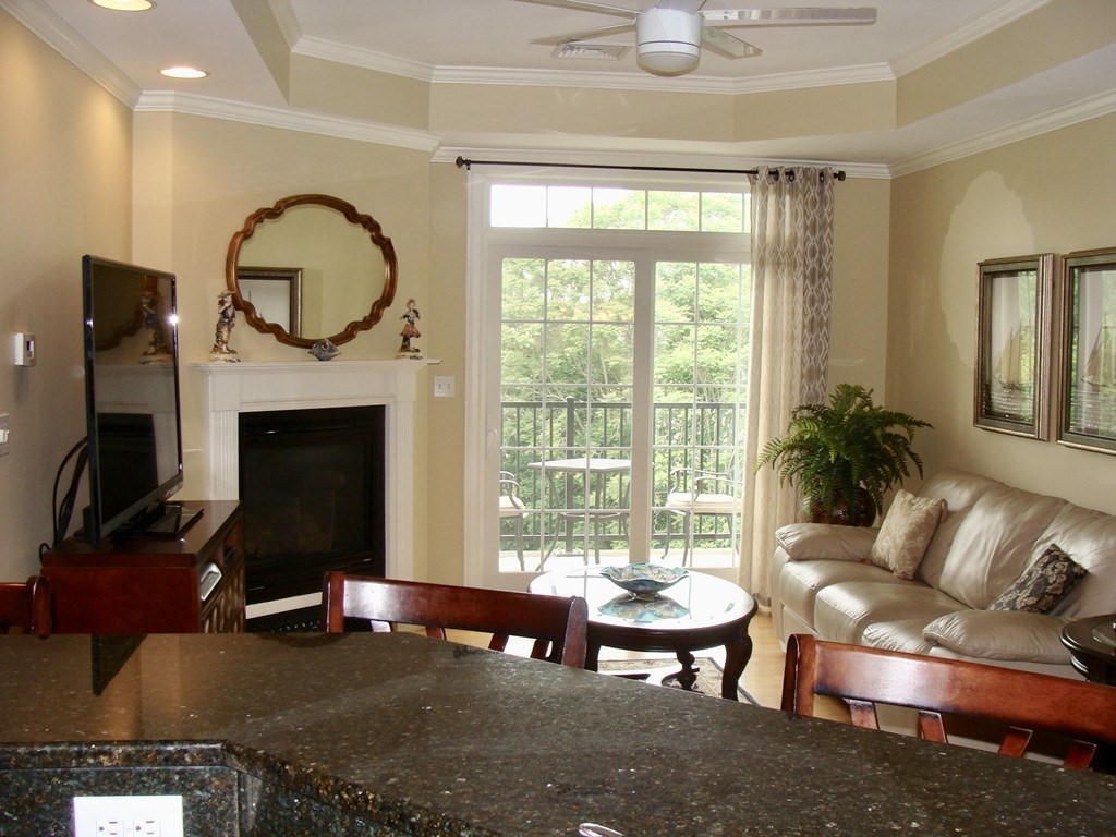 Top floor unit at Riverbend Crossing, a desirable 55+ community with beautiful views! This single level home features two bedrooms and two full baths, with 9' ceilings and abundant closet space throughout. The kitchen features cherry cabinetry, granite countertops, a breakfast bar, and recessed lighting. Additional highlights include hardwood flooring, architectural details such as columns and wainscoting, in-unit laundry, and a gas fireplace in the living room with slider access to a private balcony. Residents enjoy well-appointed common areas, including a lower level function room with kitchen, secure intercom entry, and elevator access. Off-street parking included for one vehicle. Sorry, no pets.
