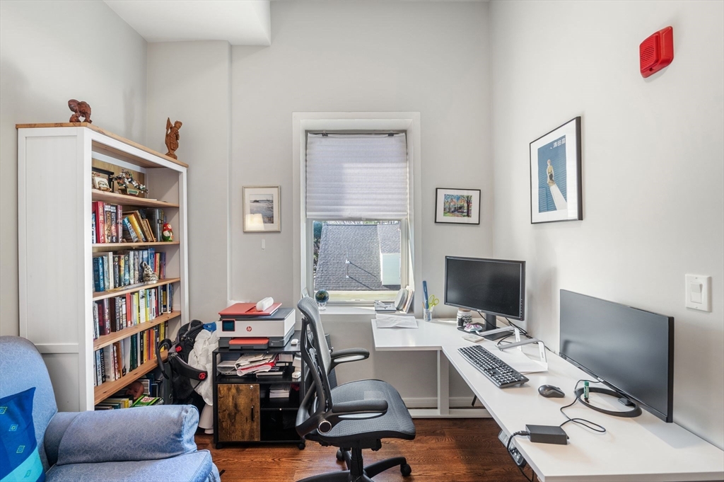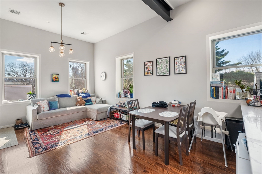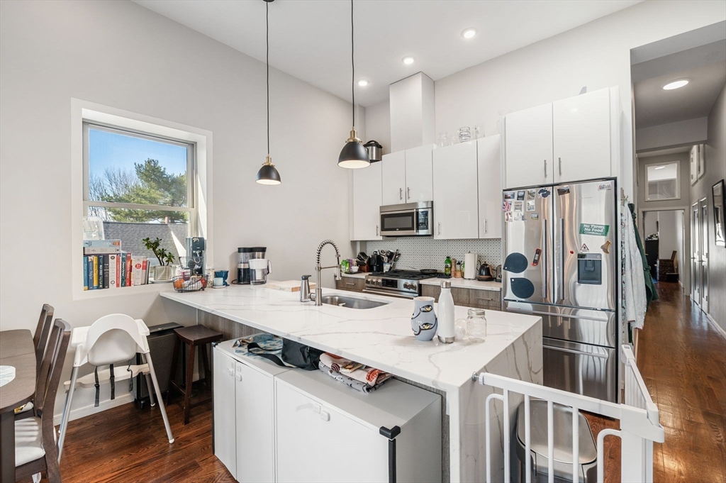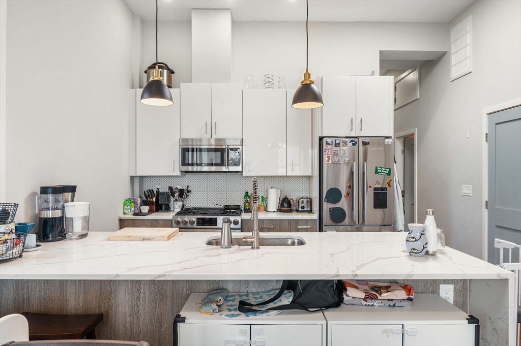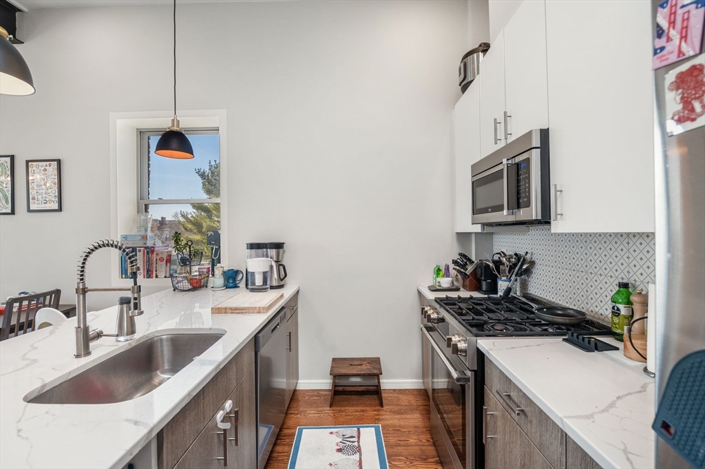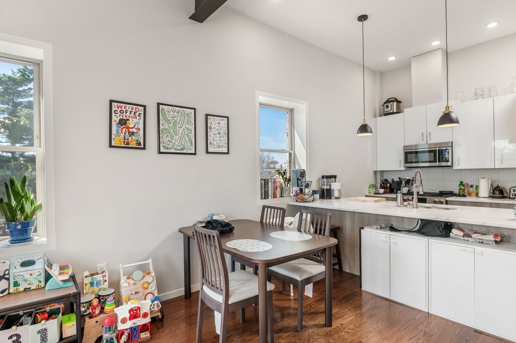 Exceptional 3-bedroom, 2-bath penthouse in a fully restored historic building, originally one of Cambridge’s first Hebrew schools and later a Portuguese fraternal organization. This landmark combines storied character with modern living, featuring soaring 10-foot ceilings, arched windows and exposed brick throughout. The kitchen is thoughtfully designed with quartz countertops, custom cabinetry, and stainless steel appliances, including a Fisher & Paykel fridge. Original steel beams, showstopping light fixtures, in-unit laundry, NEST thermostat, and DoorBird video intercom enhance everyday convenience. All 3 bedrooms are generous in size. Hardwood floors, central air, ample closet space, bike storage, and a shared yard area complete the home. Located in vibrant Inman Square, steps from award-winning restaurants and cafes, a short walk to the new Green Line extension, and moments from Union Square, this penthouse offers a seamless blend of historic charm and contemporary comfort.