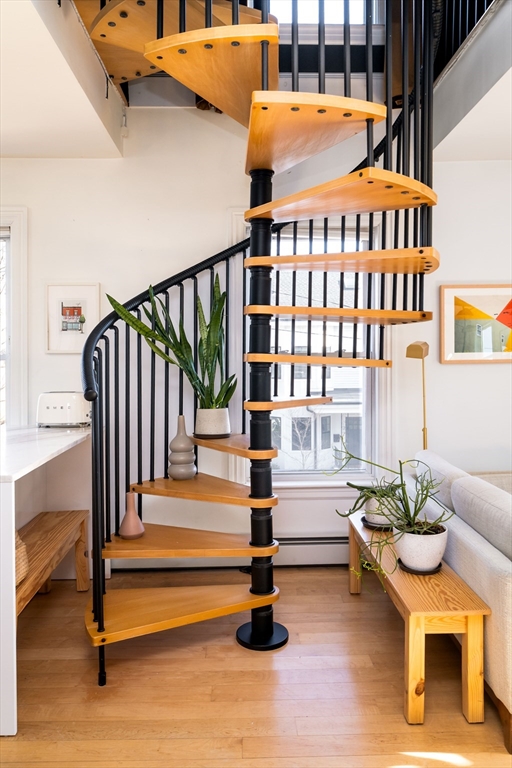 Loft-style duplex living in the heart of East Somerville - tastefully renovated and move-in ready. Steps from Michette, home to the best baguette and pastries in Camberville, and the neighborhood's growing roster of globally inspired restaurants. The first level features an eat-in kitchen with quartz countertops and stainless steel appliances, flowing into a bright and open living and entertaining space, plus a convenient powder room. Upstairs, the generous primary suite offers flexibility for a home office, with a full bathroom and ample closet space. High owner occupancy, dedicated off-street parking, large basement storage with laundry, and common outdoor patio seal the deal. Pet friendly association. Just 0.4 miles to East Somerville MBTA, with Assembly Row and Sullivan Square each under a mile away. Walkable. Bikeable. Livable.