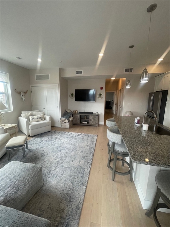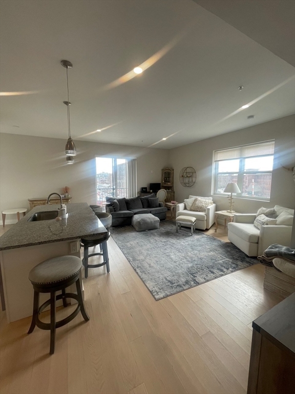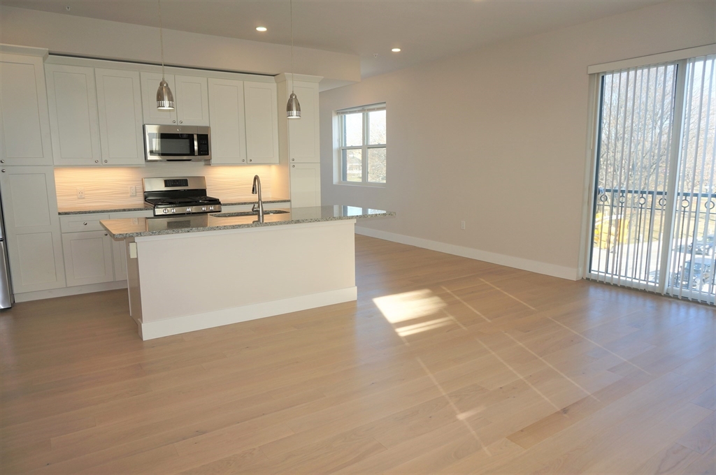Boutique, Brick Elevator Building just 4 yrs old & with 10 apartments. The largest unit with 2 beds/2baths. High quality construction brick building. Spacious 3rd floor apartment with Southern exposure. You are greeted by a long hallway with nine-foot ceilings, massive open concept kitchen with granite/SS appliances & 6-foot long island, open dining and living area, sliders to Juliet balcony. Main bedroom en-suite with two large closets. Second generous bedroom & full bath across the hallway. Laundry room w/stackable washer & dryer completes this 1370 +/- sqft unit. Tandem parking space assigned for this unit in the carport area can accommodate 2 cars.. Located in central City location, across the street from Banks Sq Park, close to everything that Waltham has to offer: train to Boston at the doorsteps, access to vibrant Moody St w/Restaurant Row & Cafes, Embassy Cinema, shops, stroll along Charles River. Video tour available. Scheduled group showings only. Sun 3/29 from 11-12noon.