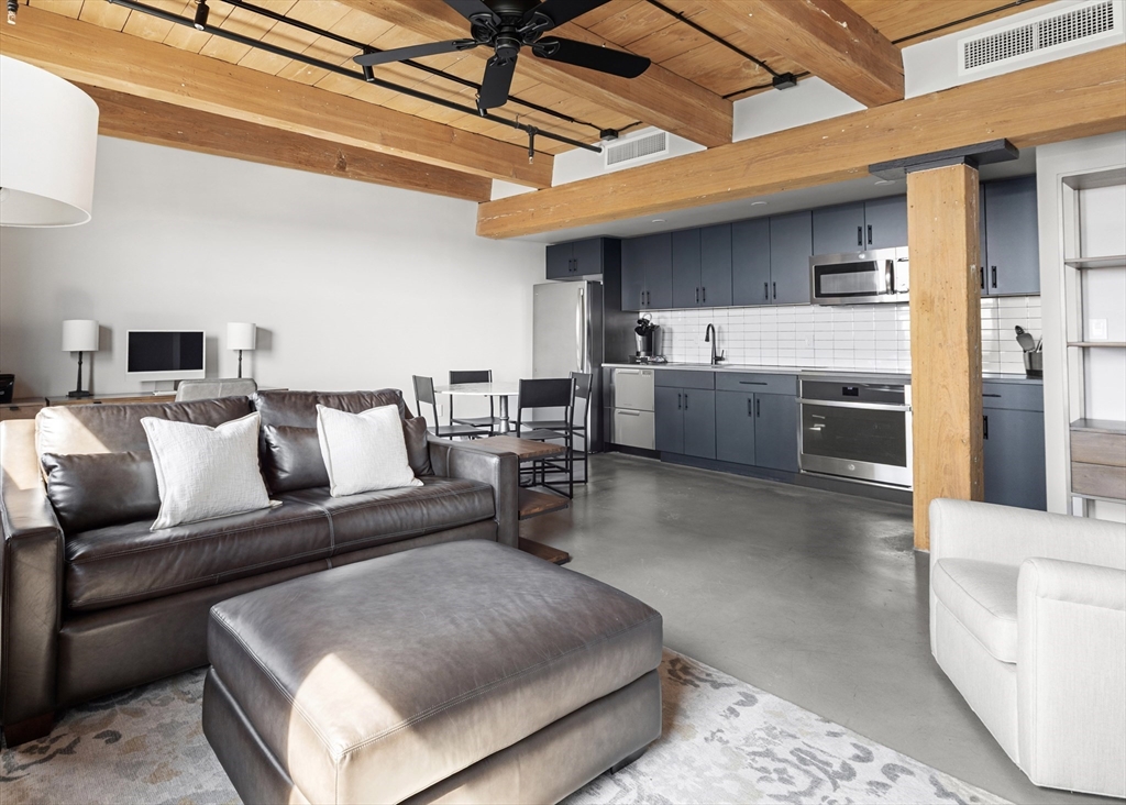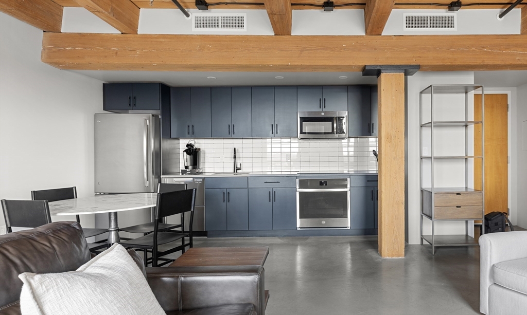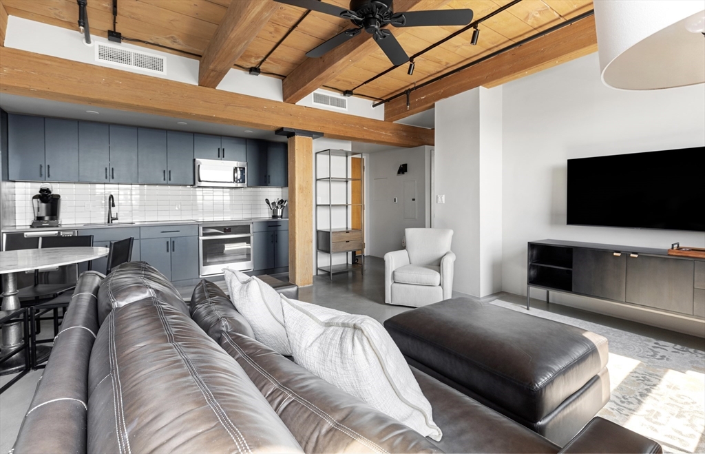 Built in 1900 this stylish brick-and-beam one-bedroom loft is in the heart of the South End’s vibrant SoWa arts district. A spacious layout offers a large living room with dining area, soaring wood beam ceilings, exposed brick, and polished concrete floors. The sleek open kitchen features granite counters, subway tile backsplash, refinished cabinetry, and new stainless steel appliances. The oversized bedroom boasts two large windows and new custom closet space. Additional highlights include central air, in-unit laundry, and deeded parking (#4). 90 Wareham is a boutique elevator building with a modern industrial lobby, ideally located among SoWa’s celebrated art studios, seasonal open market, fitness options, Whole Foods, top restaurants, and the Silver Line, with easy access to the Mass Pike and I-93.