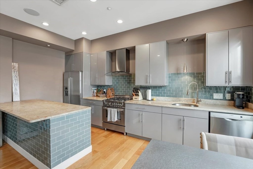 This elegantly crafted two-bedroom, two full-bathroom condominium is located in a building equipped with an elevator. The condo boasts a spacious design with an open-concept kitchen that flows seamlessly into the living room. The kitchen is fitted with top-of-the-line stone countertops, stainless steel appliances, and 42-inch cabinets. The owner has installed a generously sized center island complete with stool seating and a built-in wine and beer refrigerator. The luxurious master suite features a fully-outfitted walk-in closet and an ensuite bathroom complete with a rainfall shower head. Abundant natural light floods the space, and a washer and dryer are conveniently located within the unit. Additionally, one deeded, garage parking space with elevator access is included. The building features a sprawling common roof deck with outdoor furniture, lighting, and breathtaking views of the city and water. Don't miss out on this one!