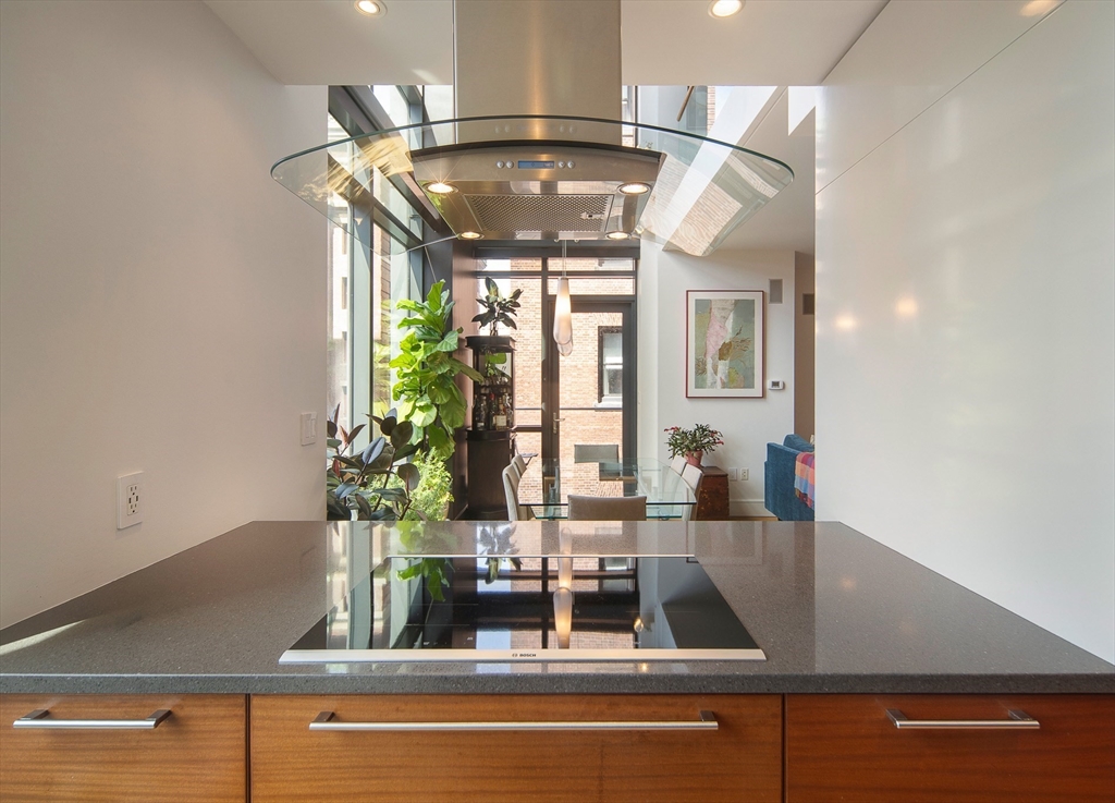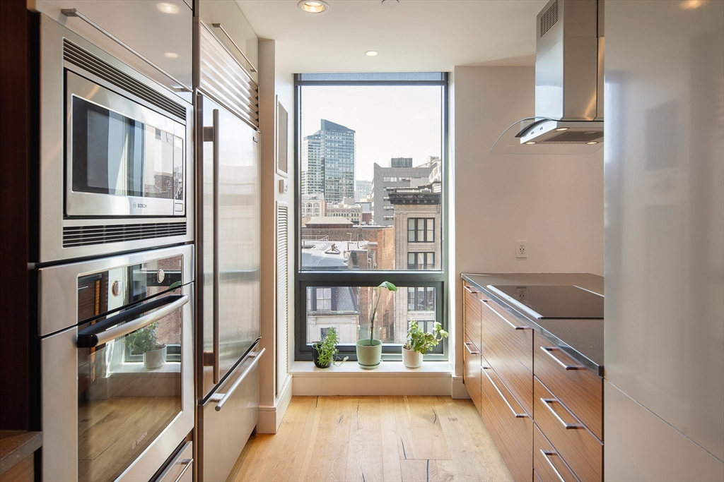 Step inside this rarely available loft style duplex with private balcony at 45 Province this custom designed two-bedroom two bathroom loft balances architectural drama with ease.Double-height ceilings stretch upward, while floor-to-ceiling windows frame sweeping views of Boston. The kitchen is anchored by sleek custom cabinetry and a suite of appliances that includes Sub-Zero refrigeration and induction cooking. Upstairs, a lofted office overlooks the main living space below. The primary suite is tucked beyond, where a spa-like bath, complete with an oversized glass shower and double vanity.Every detail has been thoughtfully considered: custom lighting, wallpaper selections, and electric blinds that disappear at the touch of a button. An integrated AV system with built-in speakers carries sound throughout, adding another layer to the living experience. 45 Province is a luxury boutique full service residence with pool, fitness center, concierge and more!