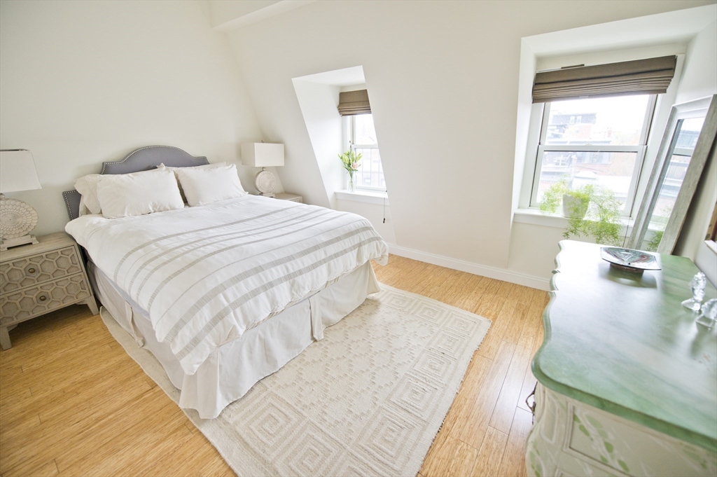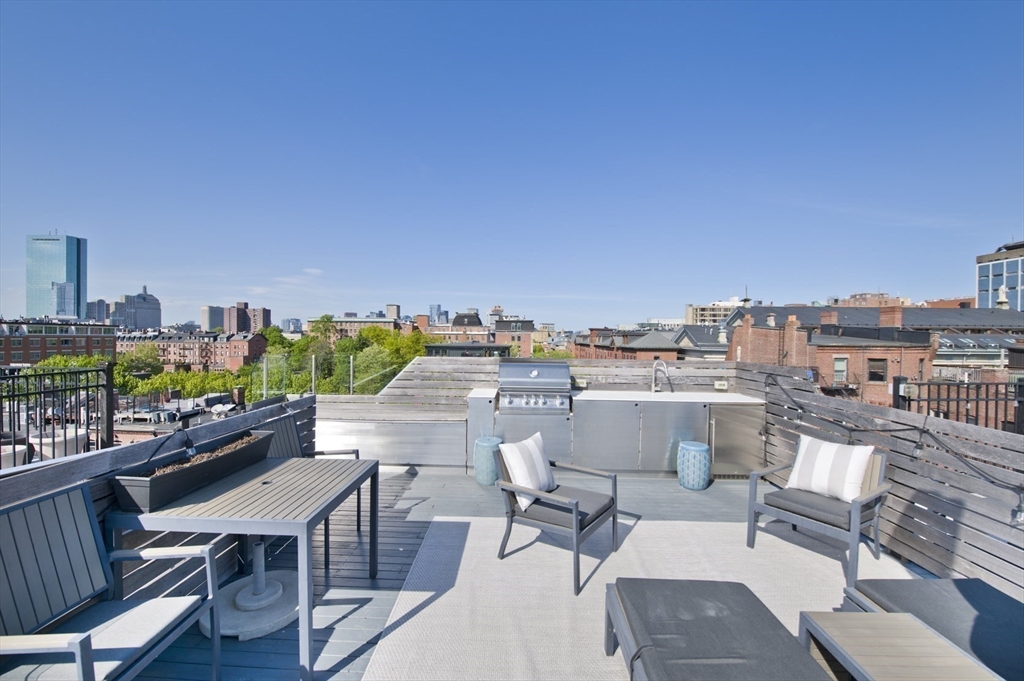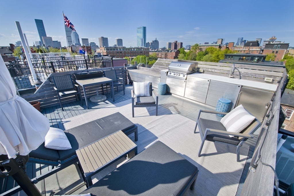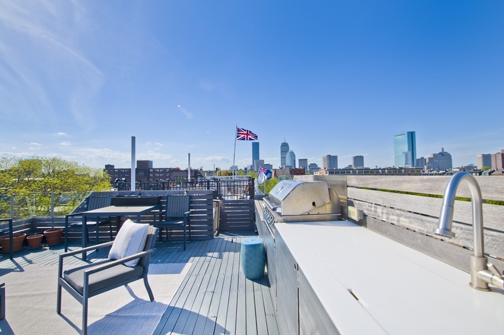 Step into this beautiful Worcester Square penthouse 2 bed just in time for summer. Friends & family may never leave when you entertain them on the oversized, private roof deck w/ sweeping skyline views. There’s a sleek, built-in outdoor kitchen w/ professional grill (connected to gas – no tanks to fill), solid stainless cabinets, Corian counters, sink w/ hot + cold water & outdoor fridge! Built-in speakers can be used w/ Sonos. The unit itself starts w/ an internal staircase leading to the main space open floor plan. Large living room w/ gas fireplace, bay window dining area & a big kitchen w/ ample cabinets, Viking range, granite counters & a HUGE island. Full bath w/ double sinks & natural stone tile. Both beds have large closets & lofted storage areas. In-unit laundry. DEEDED PARKING. Central AC. Hardwood floors throughout. Heat & hot water included in condo fee. Located on historic Worcester Sq. w/ park & fountain. Come see this unit w/ all the best that the South End has to offer!