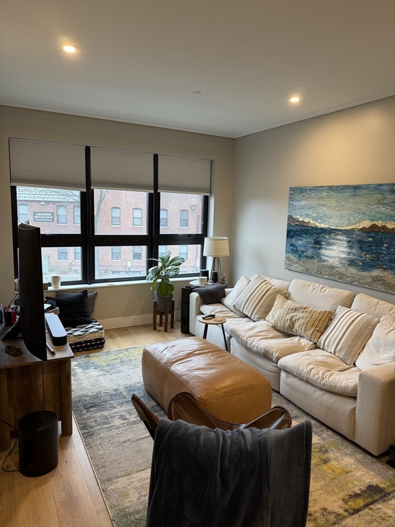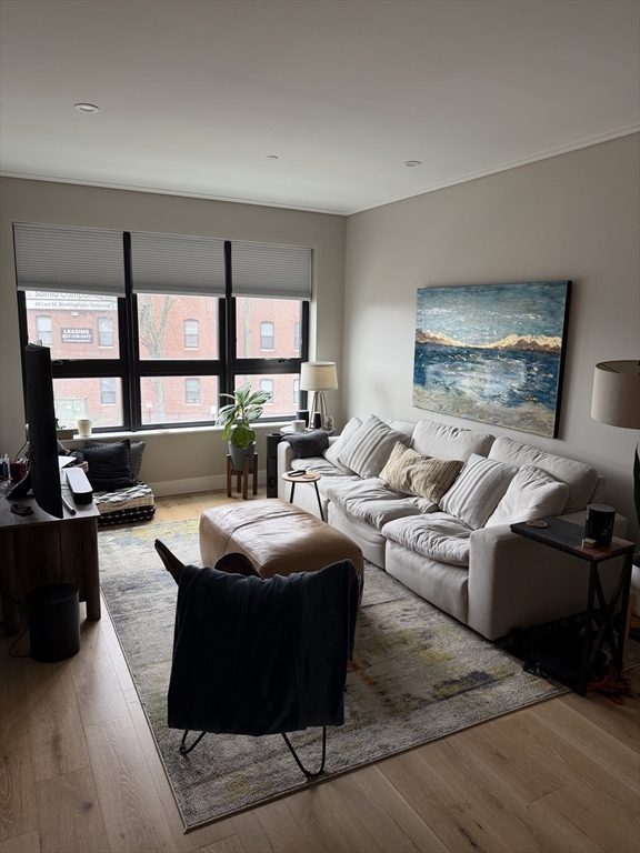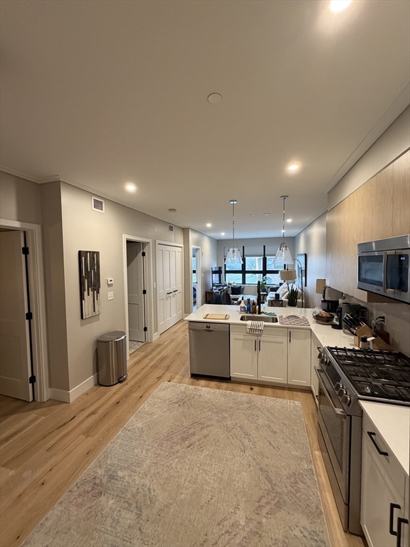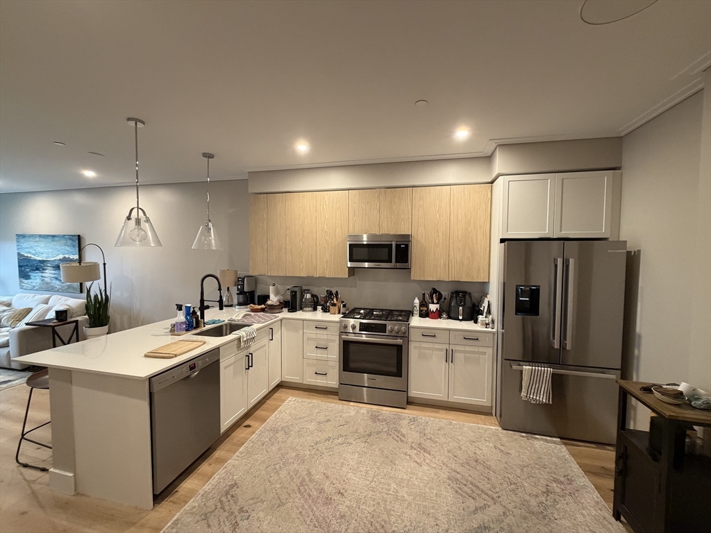 AVAILABLE FOR JUNE 1 MOVE-IN. Welcome to The Cadence, a luxury 2023-built residence just steps from the vibrant Boston Landing community in the Allston-Brighton area, near shopping, dining, and public transportation. This spacious and sun-filled unit offers one bedroom, a versatile den (ideal for a home office or guest space), and one full bathroom.The open-concept layout features a modern kitchen with high-end Bosch stainless steel appliances, quartz countertops, and elegant oak flooring, seamlessly flowing into the living and dining area. Oversized windows throughout fill the home with natural light while maintaining a quiet, private atmosphere. In-unit laundry adds everyday convenience.Enjoy a full suite of premium amenities including a fitness center, co-working space, resident lounge, spa/massage room, and a dedicated dog recreation area. The expansive outdoor patio is perfect for relaxing or entertaining during the warmer months. One garage parking space is included.