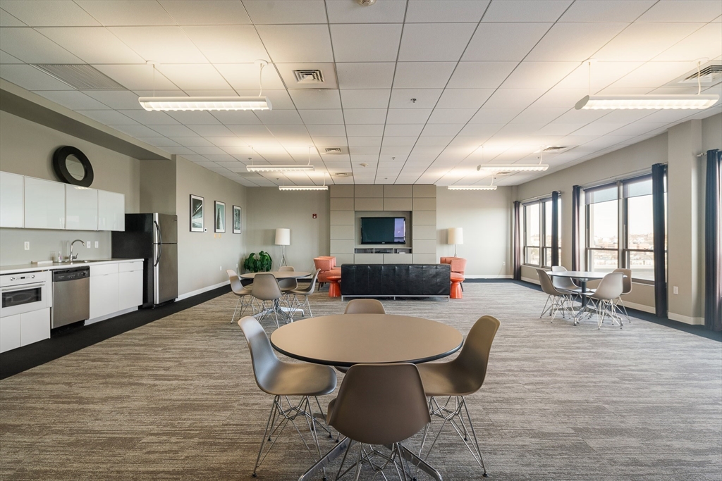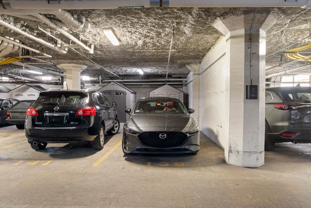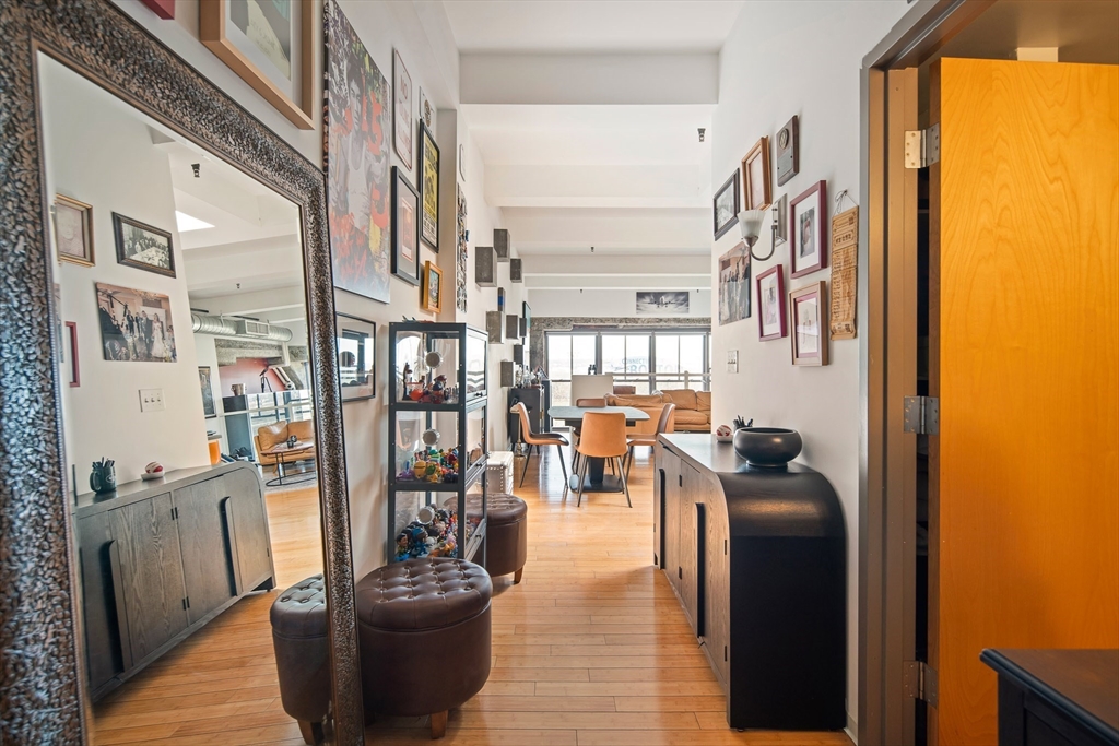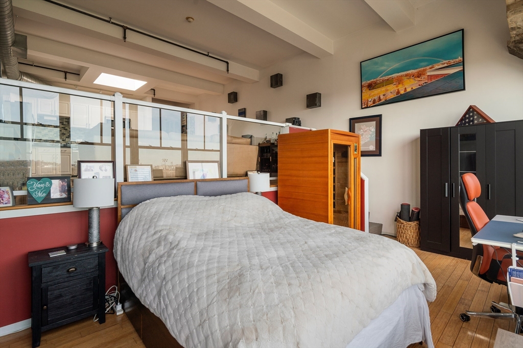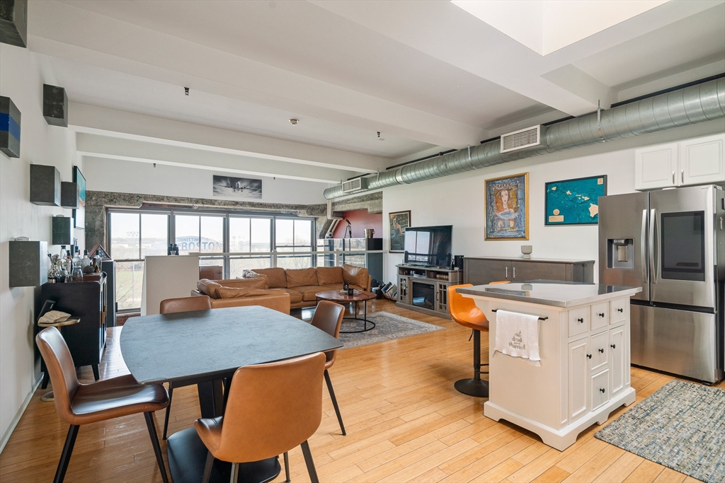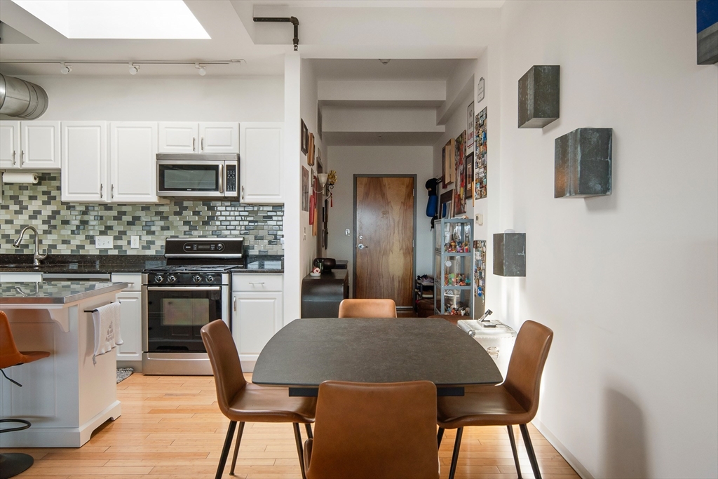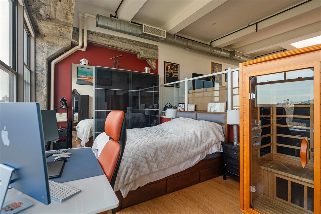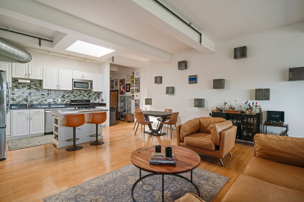 Penthouse loft living at Porter 156 blends industrial character with modern ease. Exposed brick and concrete set the tone, while floor to ceiling windows and a skylight bring in abundant natural light. A smart layout with a step down bedroom area adds separation and functionality. The updated kitchen features Bosch appliances, granite countertops, and a clean tiled backsplash. Bamboo flooring, in unit laundry, and generous storage complete the space. 2 GARAGE PARKING SPACES plus additional storage offer rare convenience. Take in sweeping park and city views from the expansive roof deck, ideal for relaxing or entertaining. This professionally managed, high owner occupancy building includes elevator access, a mail room, and shared gathering space. Just moments to the Blue Line, Maverick Square, Piers Park, and East Boston’s growing restaurant scene, with easy access to downtown, Logan Airport, and major routes. Open houses this weekend Saturday & Sunday 11-12:30pm!