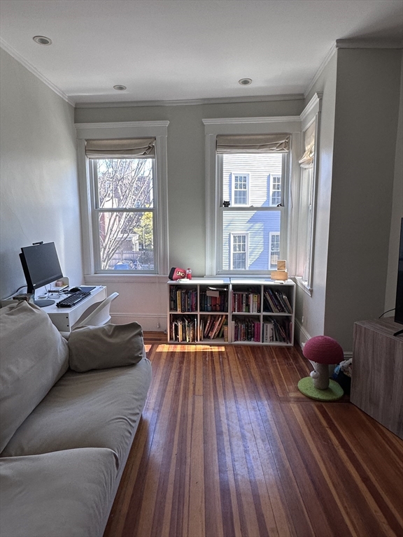 This sun-drenched 2-bedroom + office unit is ideally located just off Monument Square on one of Charlestown’s most desirable streets. This second-floor corner unit features hardwood floors, high ceilings, and walls of windows that flood the space with natural light. The spacious living room flows into a bright dining area and a modern kitchen with exposed brick, stainless steel appliances, gas cooking, a pantry, and custom cabinetry.The home offers a well-appointed primary bedroom, generous second bedroom, dedicated office, and a tiled bathroom. Additional amenities include laundry in the building and private storage. Enjoy access to a stunning common roof deck with panoramic city and harbor views. Conveniently located near the Bunker Hill Monument, shops, dining, and easy access to downtown Boston. Pets negotiable with HOA approval. Available June 1, 2026.
